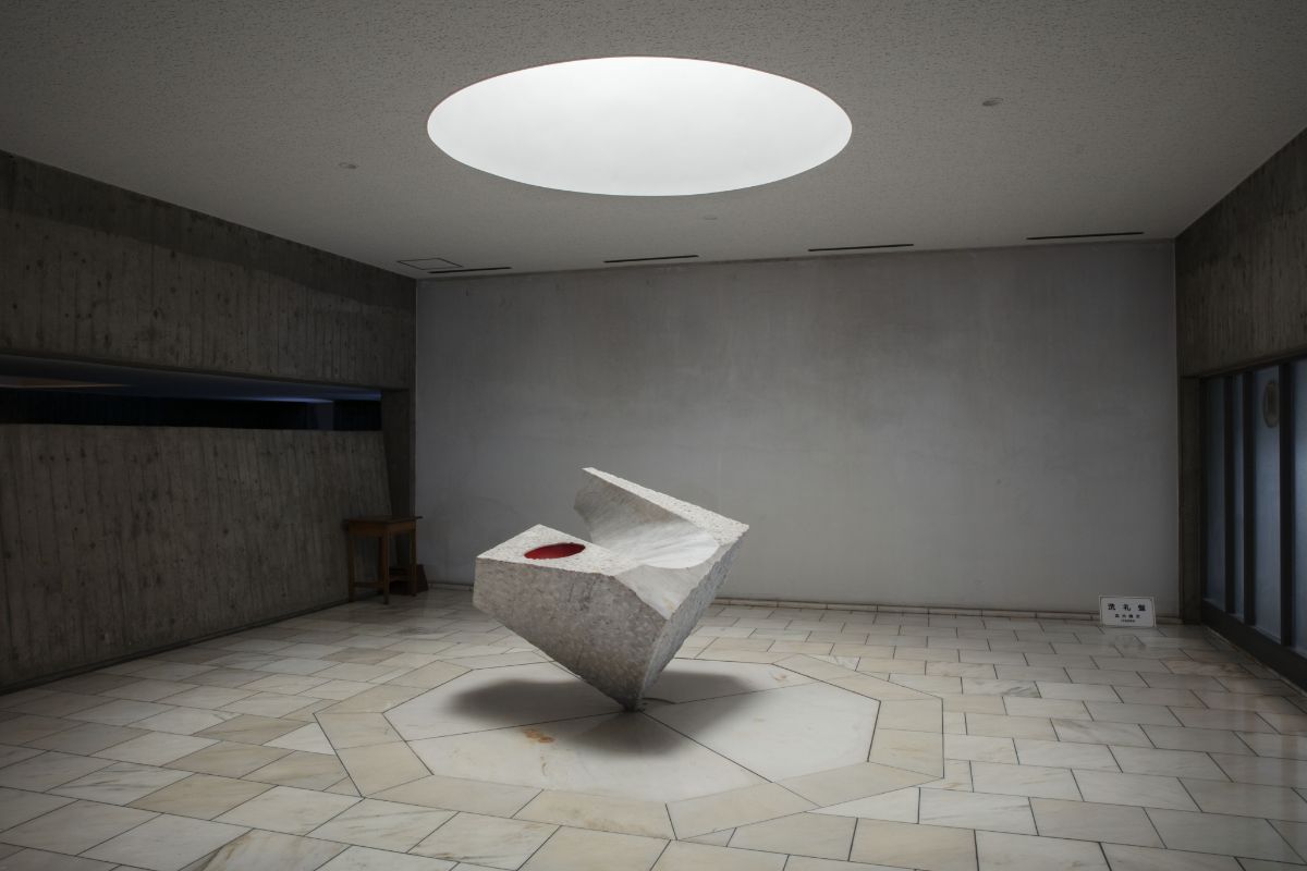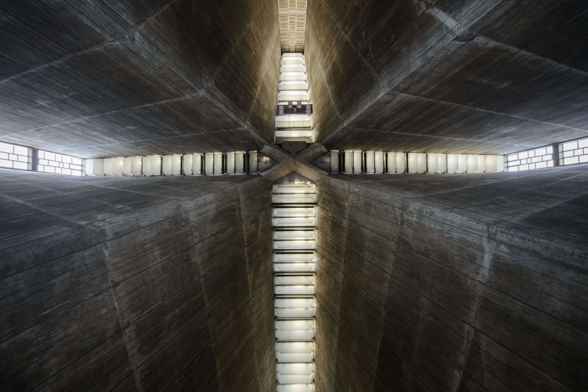 建物の内部に入り左手に進むと、上部に吹き抜けた大空間が現れる。空間に柱は一切なく、天井高は最頂部で約40m。HPシェルでできた量感たっぷりの迫力ある壁は、上に向かってグッとせり上がり、トップライトへと連続する。先に見た十字架の隙間がトップライトとなっており、日中は外光が壁面を伝って落ちてくる。RC打ち放しの壁面はストイックな表情で、そのぶん光の移り変わりによる変化が大きく感じられる。高強度コンクリートは1回につき4mの高さで打設され、内壁は打ち放し仕上げのために入念に施工されたという。