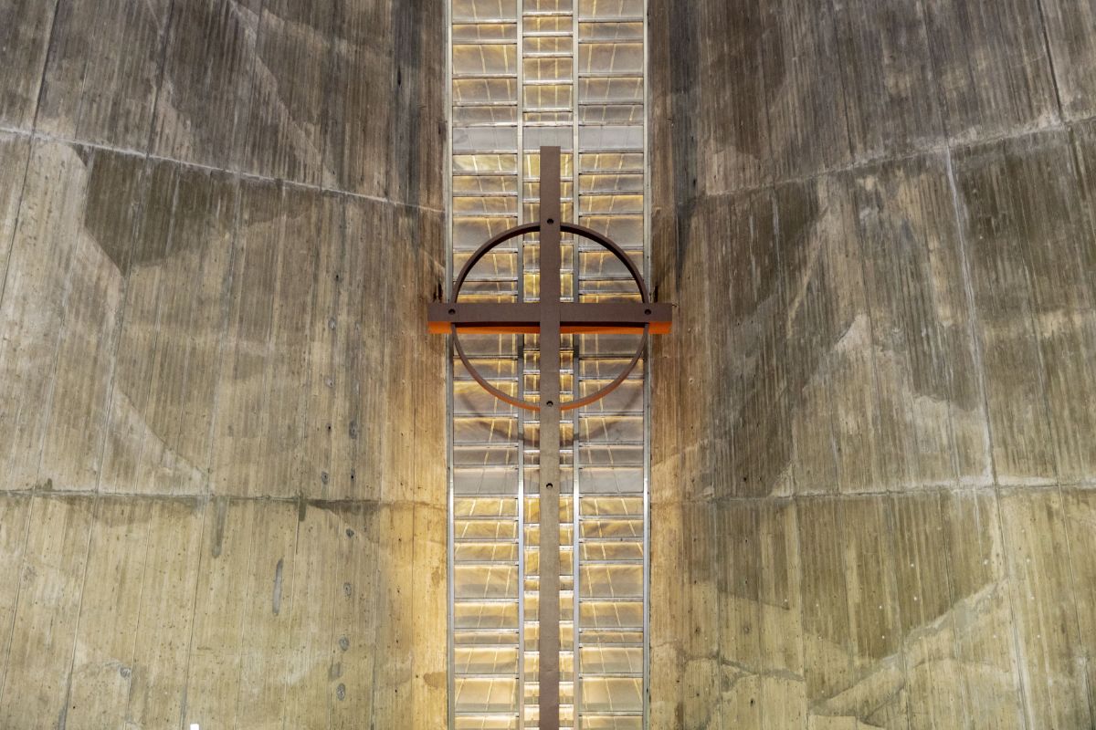 聖堂正面奥には、イエス・キリストによる最後の晩餐の食卓をかたどった祭壇が設置されている。その祭壇の背面では高さ17mの十字架が、その奥の黄金色に鈍く輝く壁面から浮かび上がる。この壁面は、アラバストル大理石を薄く切り出して格子状にはめ込んだもの。絵画などのモチーフとしてたびたび引用される、「ヤコブの夢」に登場する「天使の梯子」を連想させるものとなっている。
