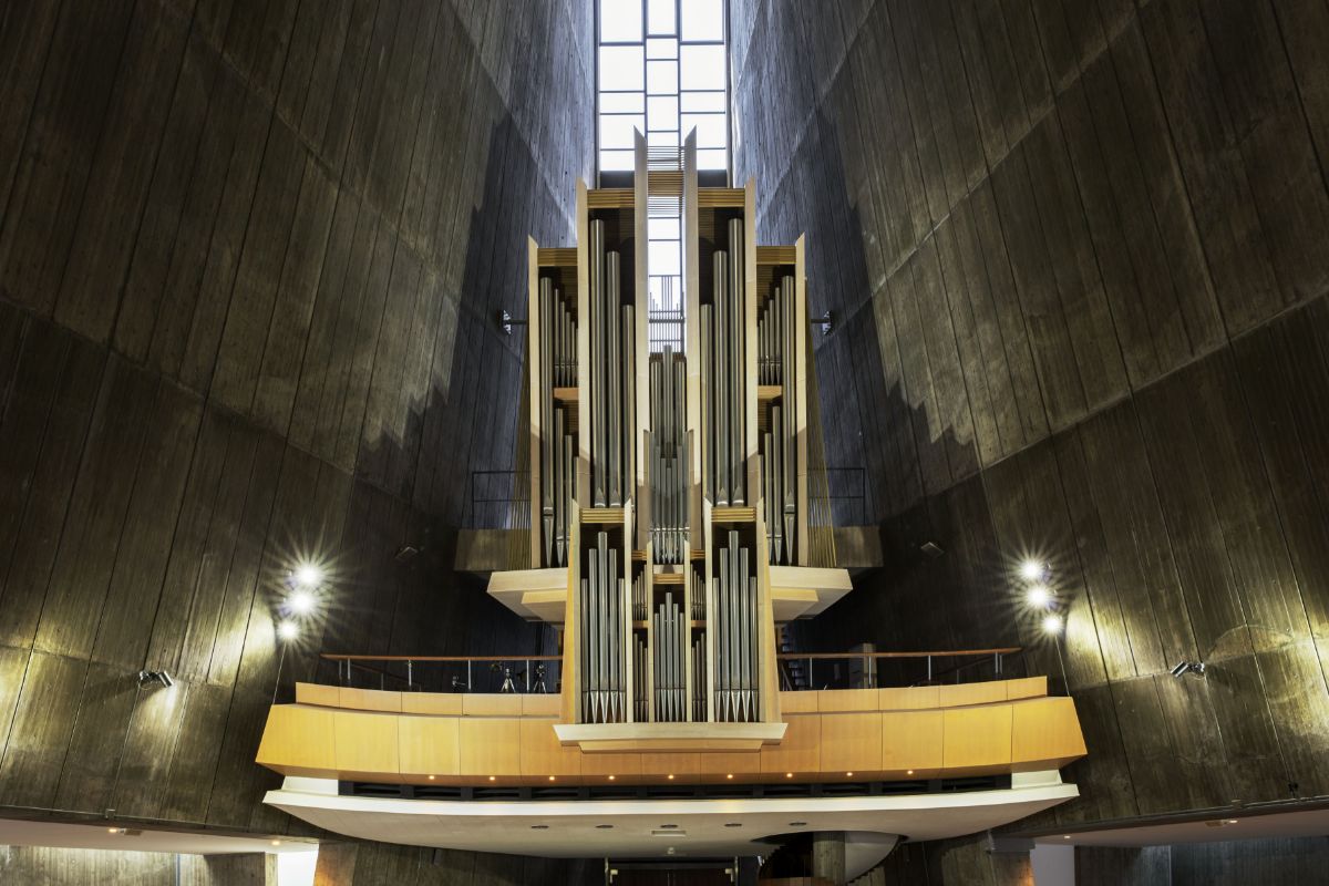 聖堂後方の上部には、教会の集会祭儀に用いるパイプオルガンが設置されている。パイプに風を通して音を出すオルガンは、2004年に献堂40周年を記念して竣工時のものから取り替えられた。平野さんは「合計3,122本のパイプで構成されるオルガンはイタリアから搬入され、来日したオルガンビルダーが約3カ月をかけて組み立てたものです」と説明する。