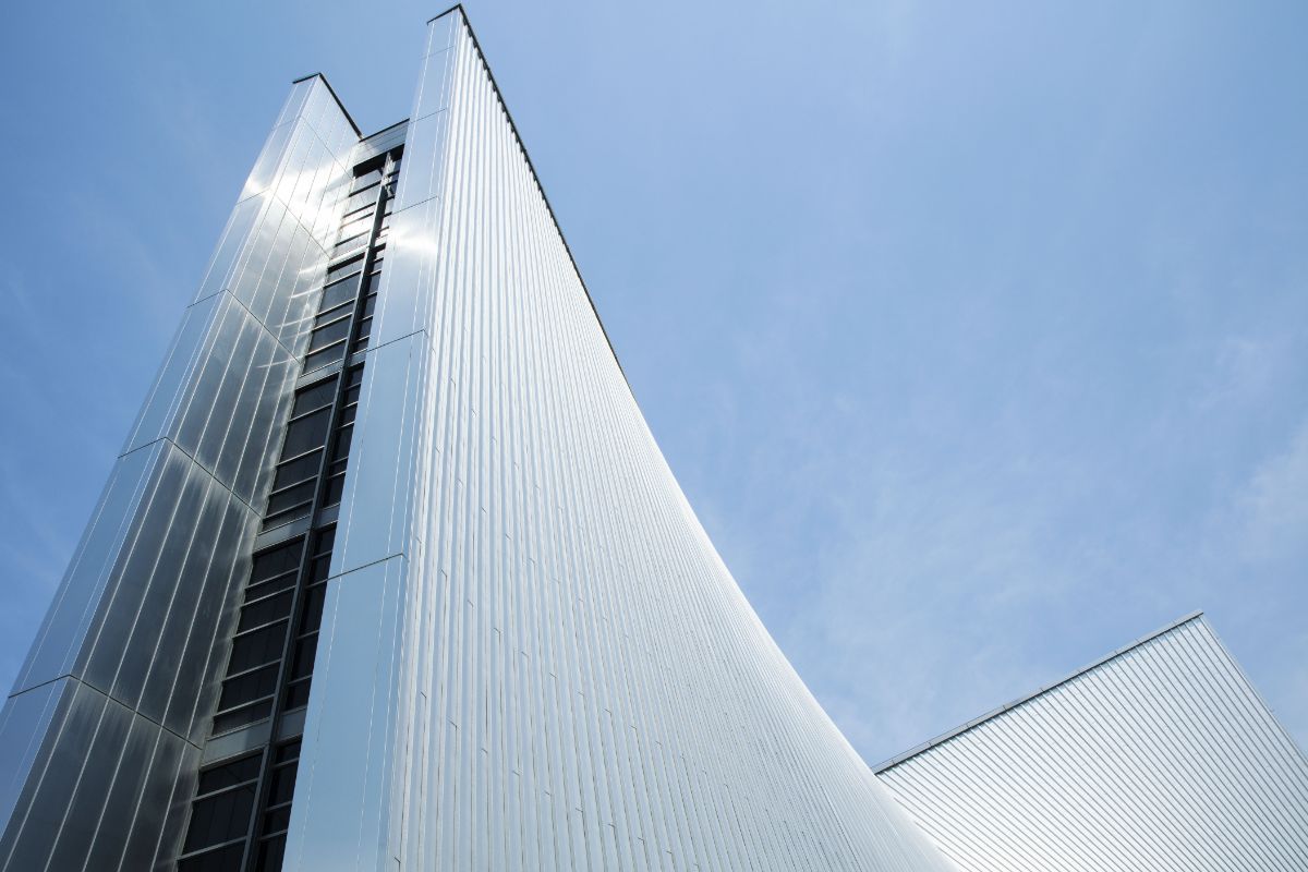 建物は、HPシェルと呼ばれる双曲放物面をもつ鉄筋コンクリート造の版によって構成され、版の外側には全面にステンレス板が張られた。8枚(4種類)のHPシェルは上部に向かうほど垂直に立ち上がっていき、2枚ずつが隙間を設けて立てかけられている。この隙間は頂部で交差しながら連続し、上空から見ると十字架のかたちが現れるという、建物全体を駆使した鮮やかな仕掛けが施された。