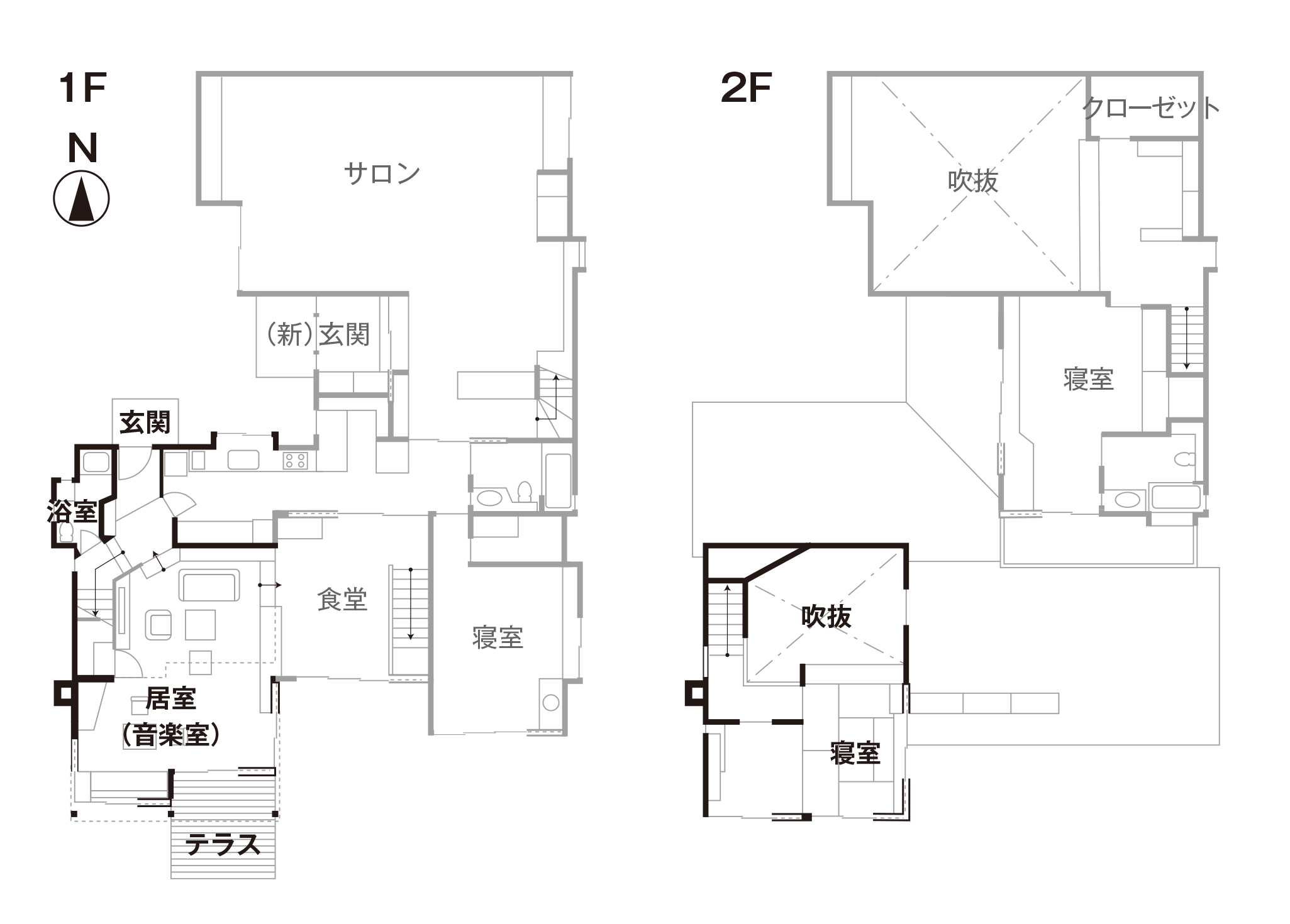 園田からあがった唯一の要望は「グランドピアノを2台置いて弾けること」。そのほかはすべて、吉村に一任されたという。玄関から入って正面にある、斜めに設えられた壁の引き戸を開けると、ピアノ2台が並べられていた吹き抜けの空間が現れる(上記図面の「居室」部分)。この音楽室の床は、踏み石のような段で玄関から2段下げられ、庭先のテラスへとスムーズにつながっている。