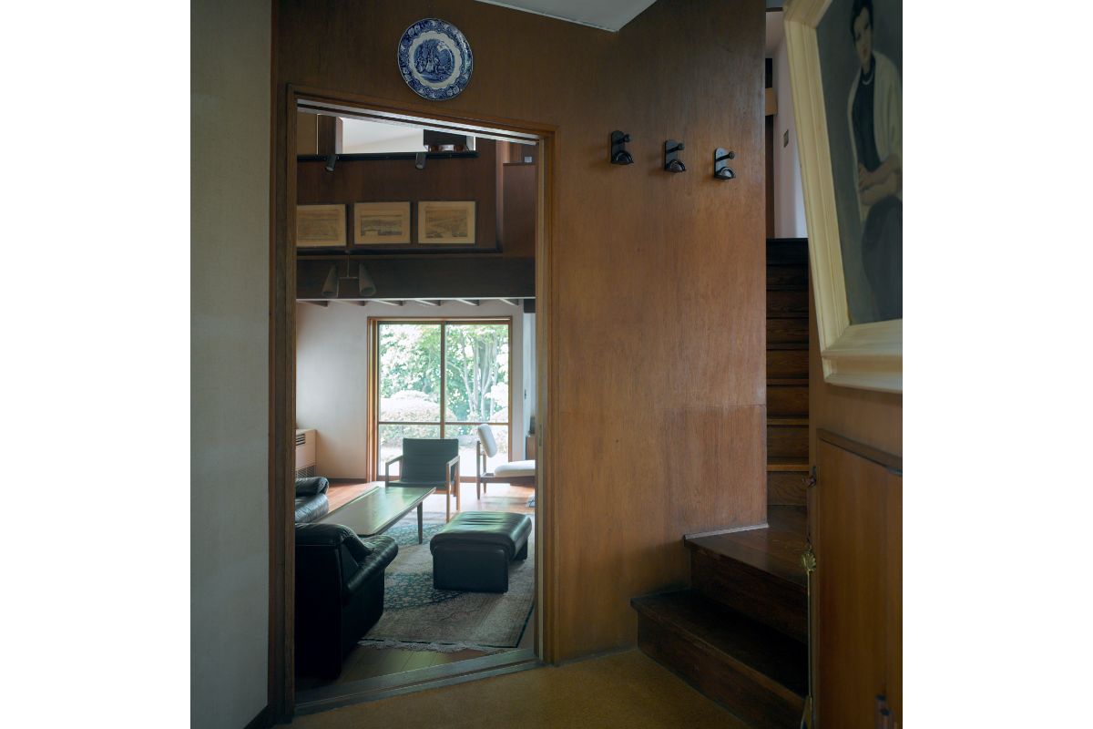 緩い勾配の切妻屋根を抱き、切妻面の白い漆喰壁の下には高さを抑えた庇(ひさし)が手前に伸びる。庇の下にある玄関扉は、下見張りの外壁と同化するように控えめに設けられている。落ち着きのある上品なたたずまいは、日本のモダニズム建築シーンを牽引しながら個人住宅も多く手掛けた、建築家・吉村順三によって生み出されたものだ。