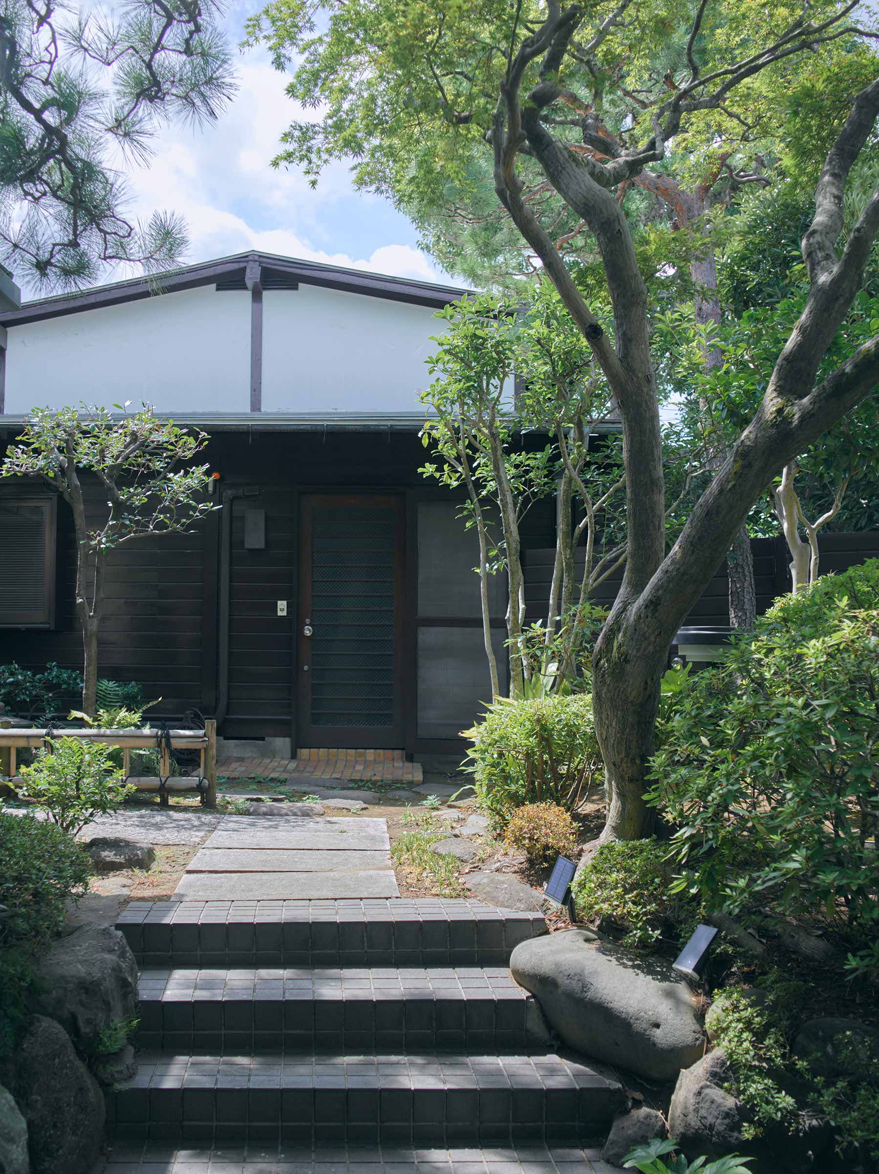 再開発が進む自由が丘駅周辺から商店街を抜け、閑静な住宅街に入るあたりに、大きなクスノキなどの緑に覆われた一角がある。坂に面した門を通り右手に折れ、石の階段を上がって正面に現れる邸宅が、今回紹介する「旧園田高弘邸(現・伊藤邸)」である。