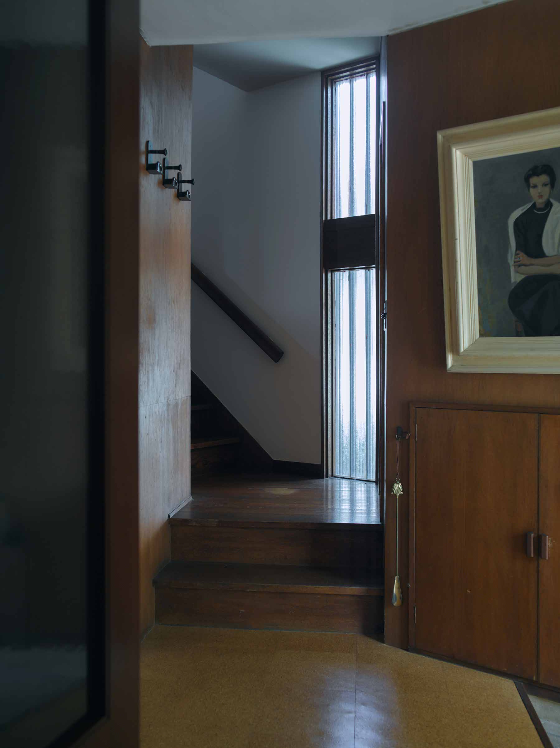 玄関から入って右手にある階段を2段上がると踊り場があり、この右手に浴室がある。踊り場からさらに階段を上がると、2階へと至る。ここから吹き抜けを介して音楽室を見下ろすことができ、右手は書斎、正面は寝室へと続いている。