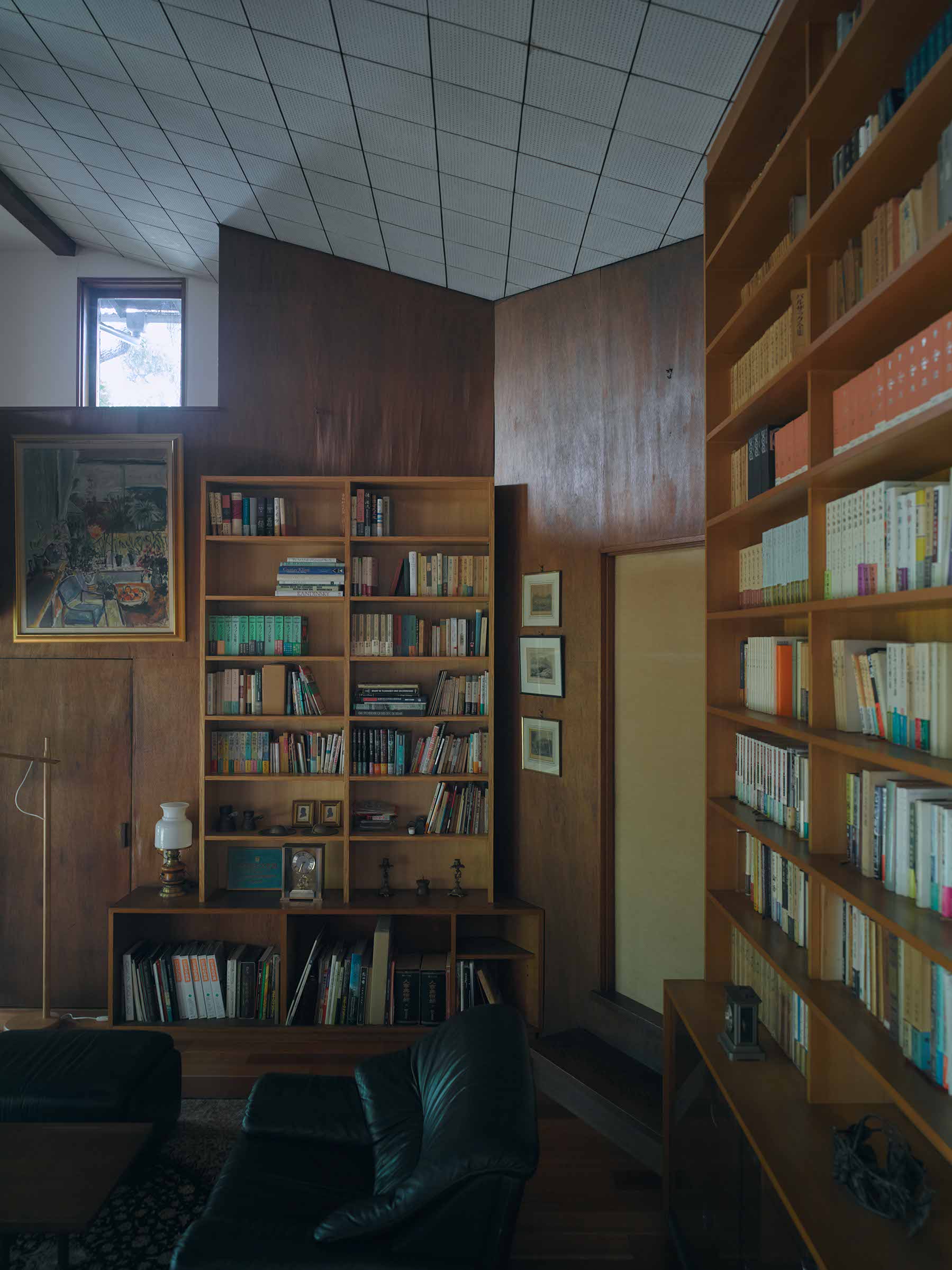 吹き抜けを見上げると、天井は勾配が付けられて斜めになっており、表面には有孔ボードが張られている。日常的にピアノの音色が響き渡るなかで、不要な音の反響を避け、吸音効果を高める狙いがあったとされる。玄関との間の壁が斜めに角度が振られていたことも、反響を防ぐことを意識した結果だろう。東側の壁には、後に増築されるまでは吹き抜けいっぱいの縦長窓があり、これは日中に譜面台へ安定した光が届くように配慮したものであったという。