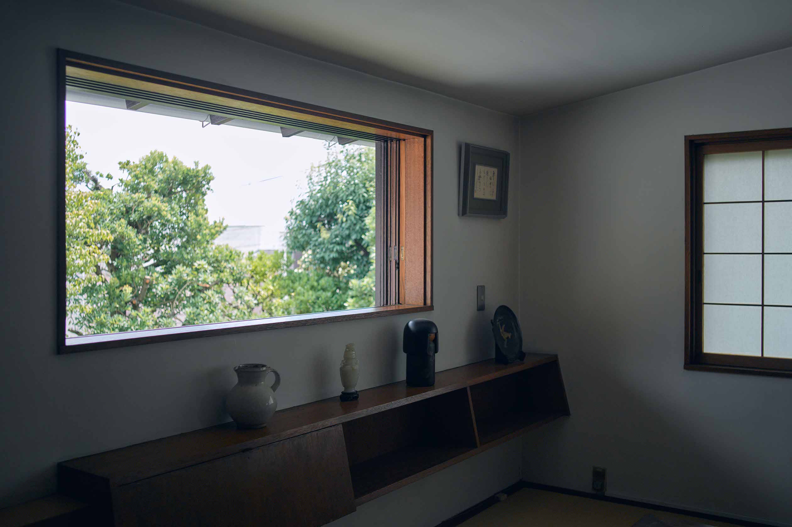 現在は和室となっている寝室は、当初はフローリングの床で、ベッドのヘッドボード側の東面壁には横長の窓が設けられている。この窓も1階と同じく、複数の戸が壁の中に引き込めるようになっており、庭の緑を楽しむことができた。室内側の吹き抜けに面しては、腰壁の上に引き違いの襖戸が設けられており、音や空気を適宜遮ることができる。