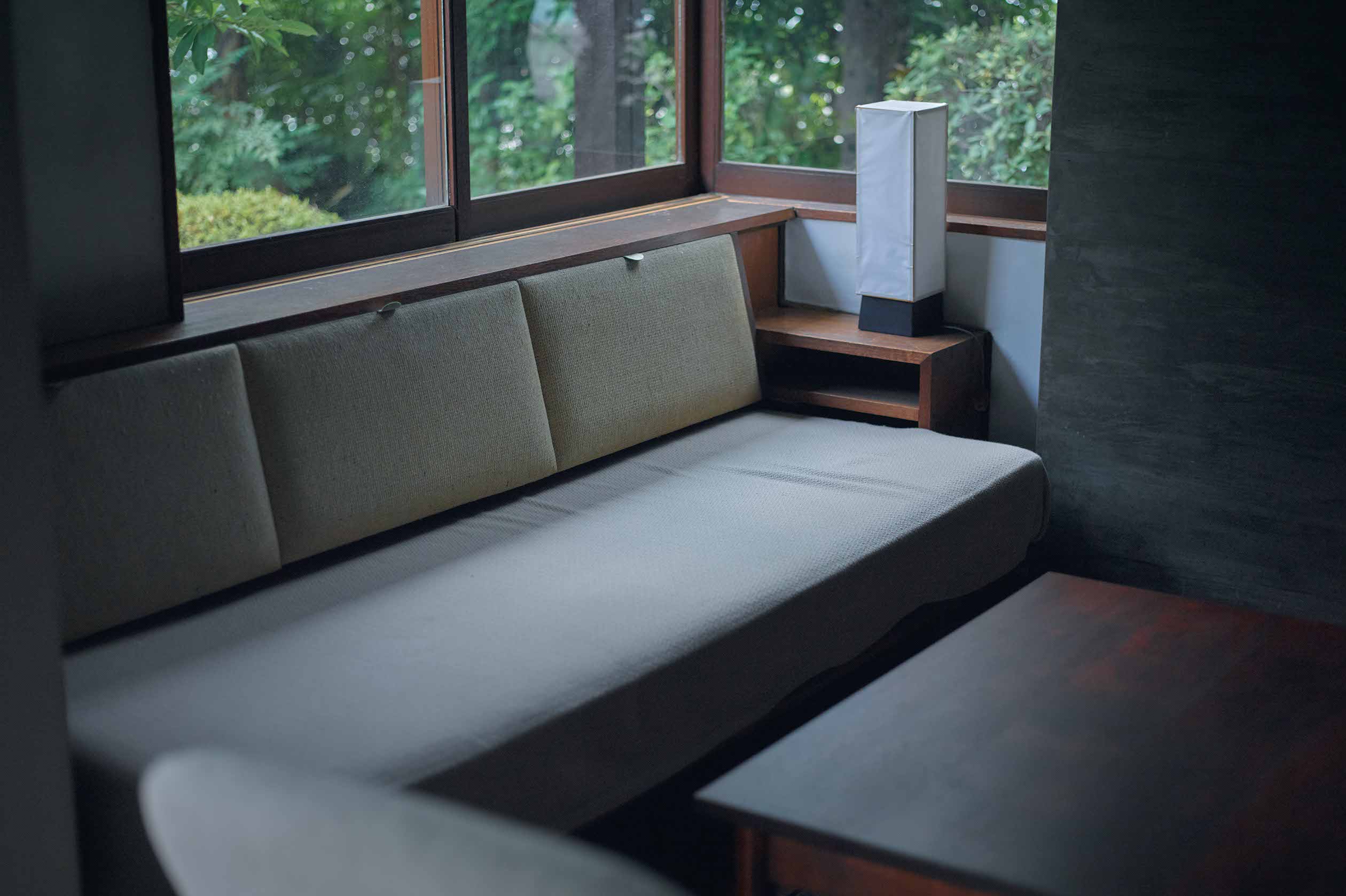 そしてRC造の壁から続く南西のコーナーには、角の柱から内側に少し離して腰窓がL字型に設けられている。障子戸とガラス戸、網戸、雨戸が仕込まれた窓で、すべてを脇の戸袋に引き込むことができ、開放感を自在に得ることができる。窓際に造り付けられたソファは、座面を手前に引き出すとベッドになり、背もたれ部分には収納が組み込まれている。