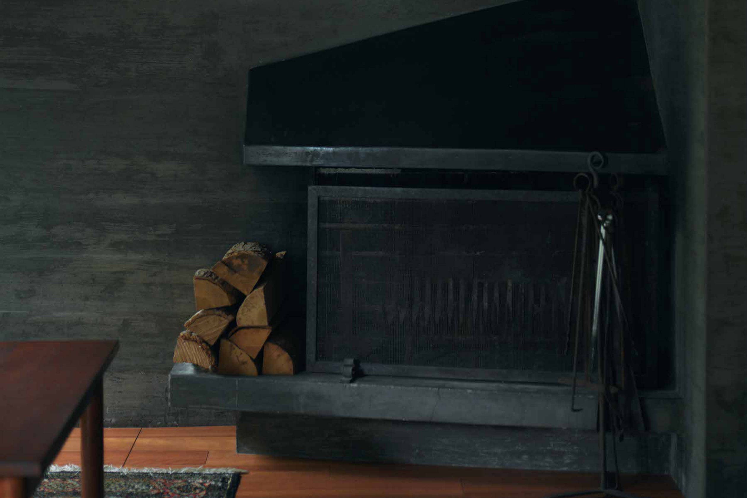 1階の右手奥は、2階の床下にあたるスペースで、ソファと暖炉のあるリビング空間がおさまっている。ピアノのある吹き抜け空間との仕切りはないものの、天井高の低い親密なスケールで、しっかりとした重心のある居住空間である。暖炉周辺の壁部分のみがRC造で、壁には1枚だけ飾り棚が付けられている。
