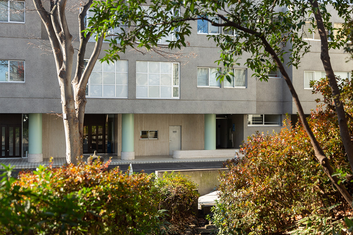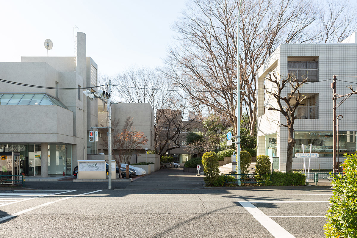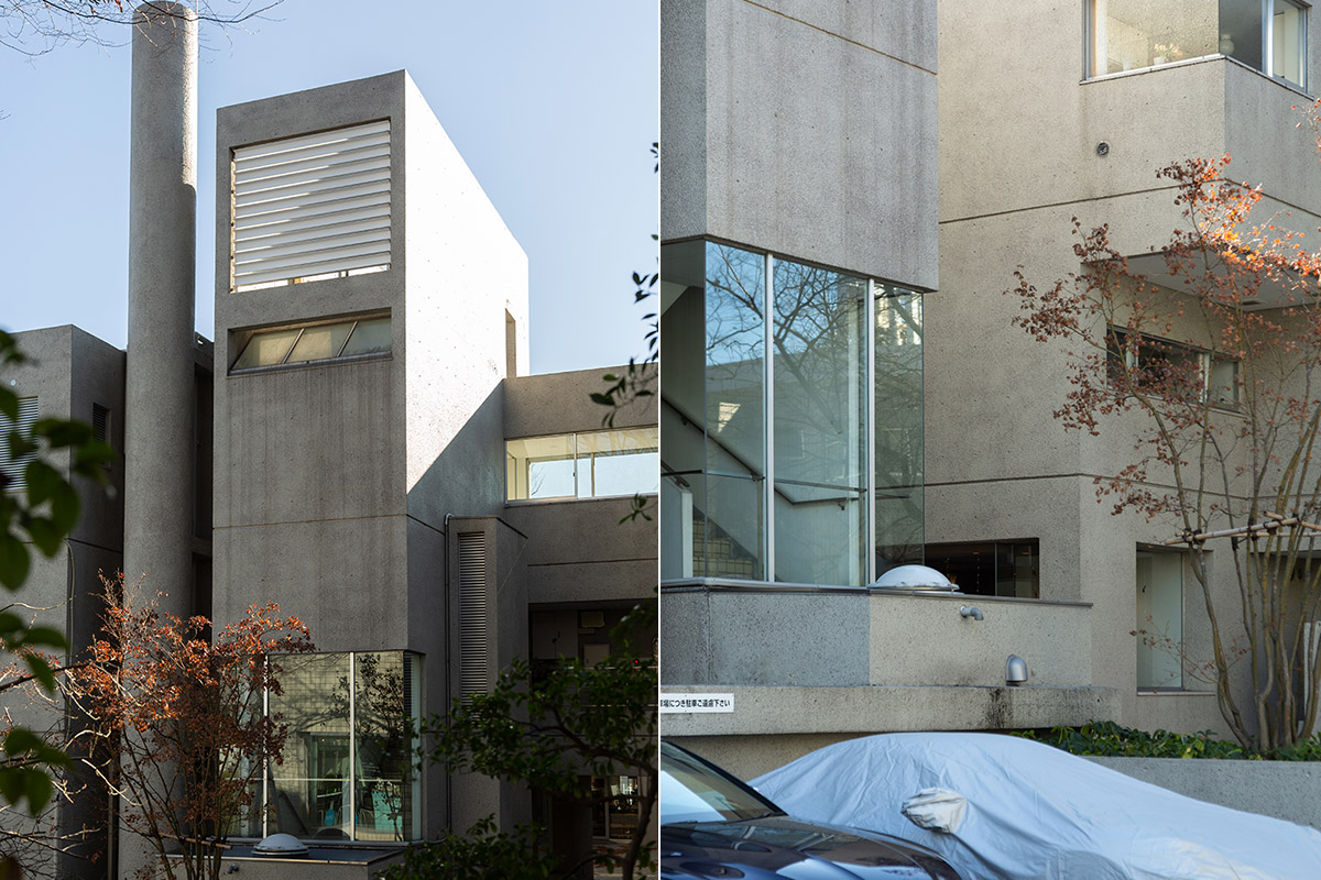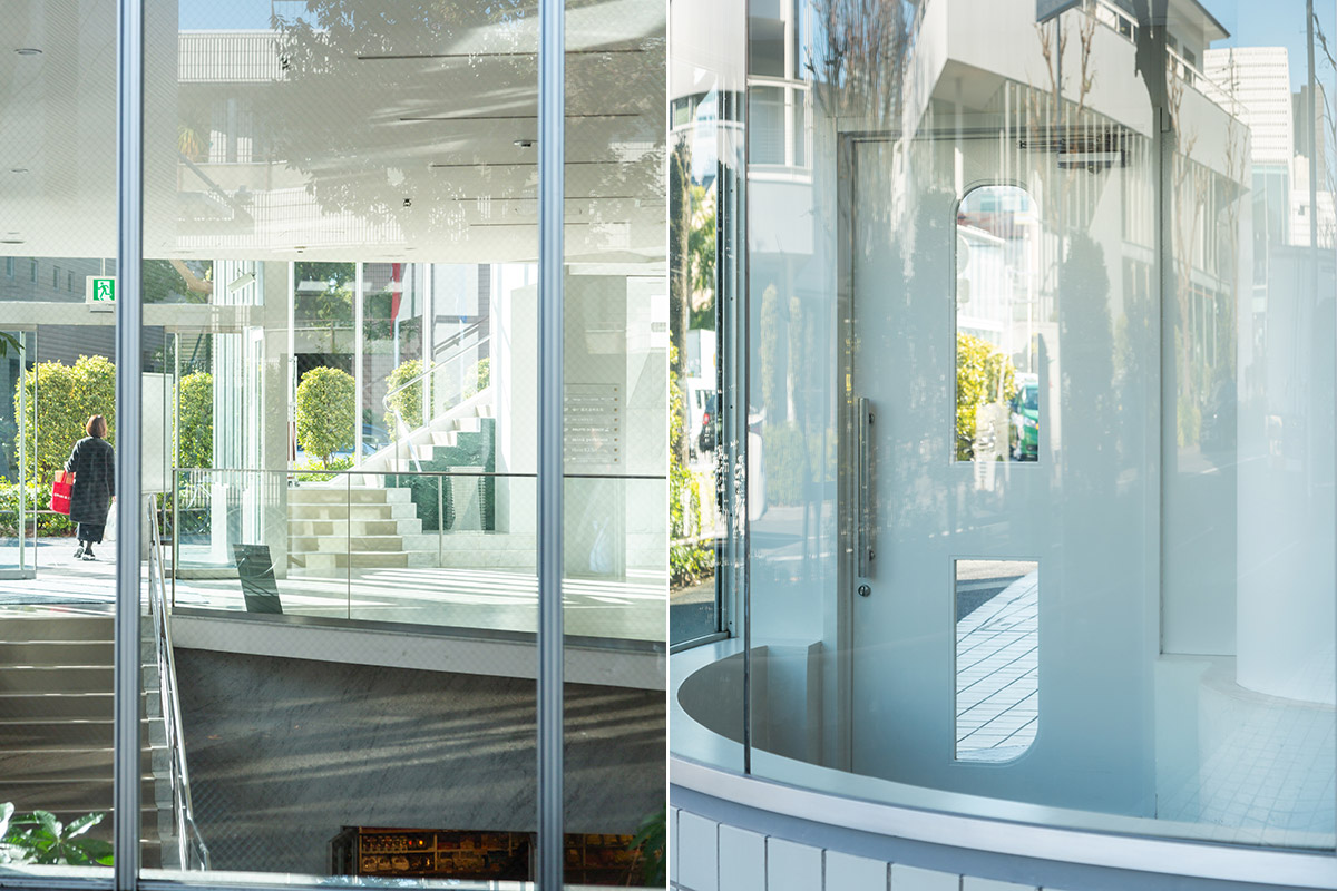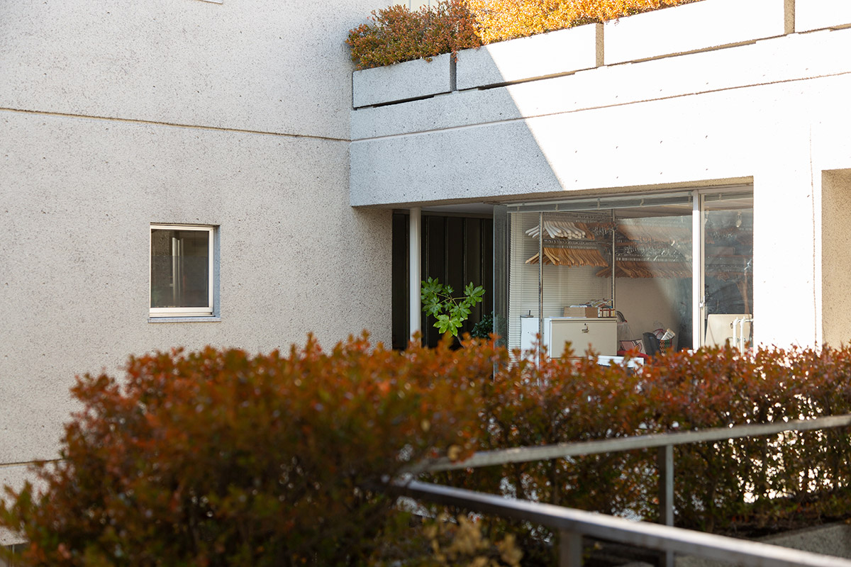 隅入りとはコーナーから建物へアプローチする形式をいう用語で、日本の伝統的な空間構成に多く見られるものだ。伝統的な西洋建築は多くが左右対称の空間構成で、中央に入り口を設ける。それに対し日本の屋敷は正面からのアクセスを良しとせず、あえてズレを設ける。「ヒルサイドテラス」の敷地隣には重要文化財に指定される歴史的建造物の旧朝倉家住宅があるが、槇はこれを意識しながら、西洋の権威的な構成ではなく親しみやすい空間の実現を目指した。ほぼすべての棟でそれが採用されており、代官山駅から歩いてくると道なりに自然と建物へアクセスができる。それと言われなければわからない細かな仕掛けで、「ヒルサイドテラス」は街と人と繋ぐ。