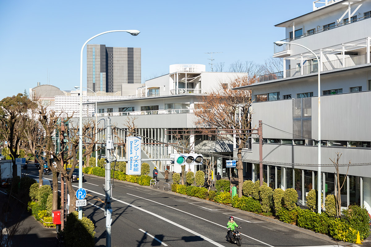 槇の信念は、たとえばF棟とG棟の間に設けられた広場にも表れている。高さを抑えた建物に囲まれた凹状の広場にはケヤキを植え、正面奥にはオープンカフェを設けた。ガラスを多用するので建物内部の奥まで視線が届き、内外ともに開放感が溢れる。また広場からは旧山手通りに対してやや斜めの角度がつけられた小道が設けられ、自然と人々を奥へ誘う仕掛けもある。さらにこの広場では定期的にマーケットが開かれ、イベントで賑わう週末も多い。