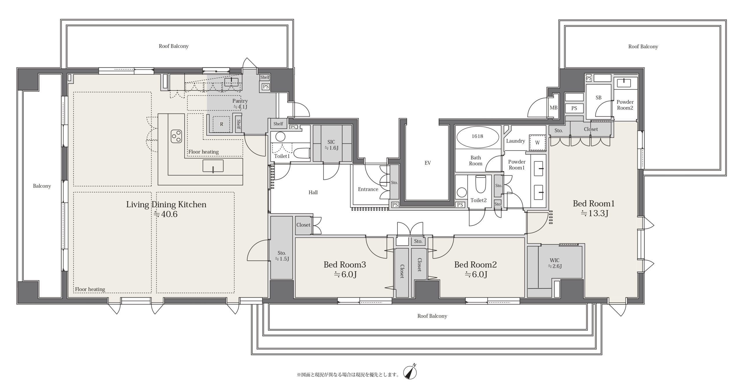 本邸は4方角住戸・全室バルコニー付き・170平米のゆとりある一邸。内装をグレートーンでコーディネートした、穏やかで落ち着きのある上質な住まいです。