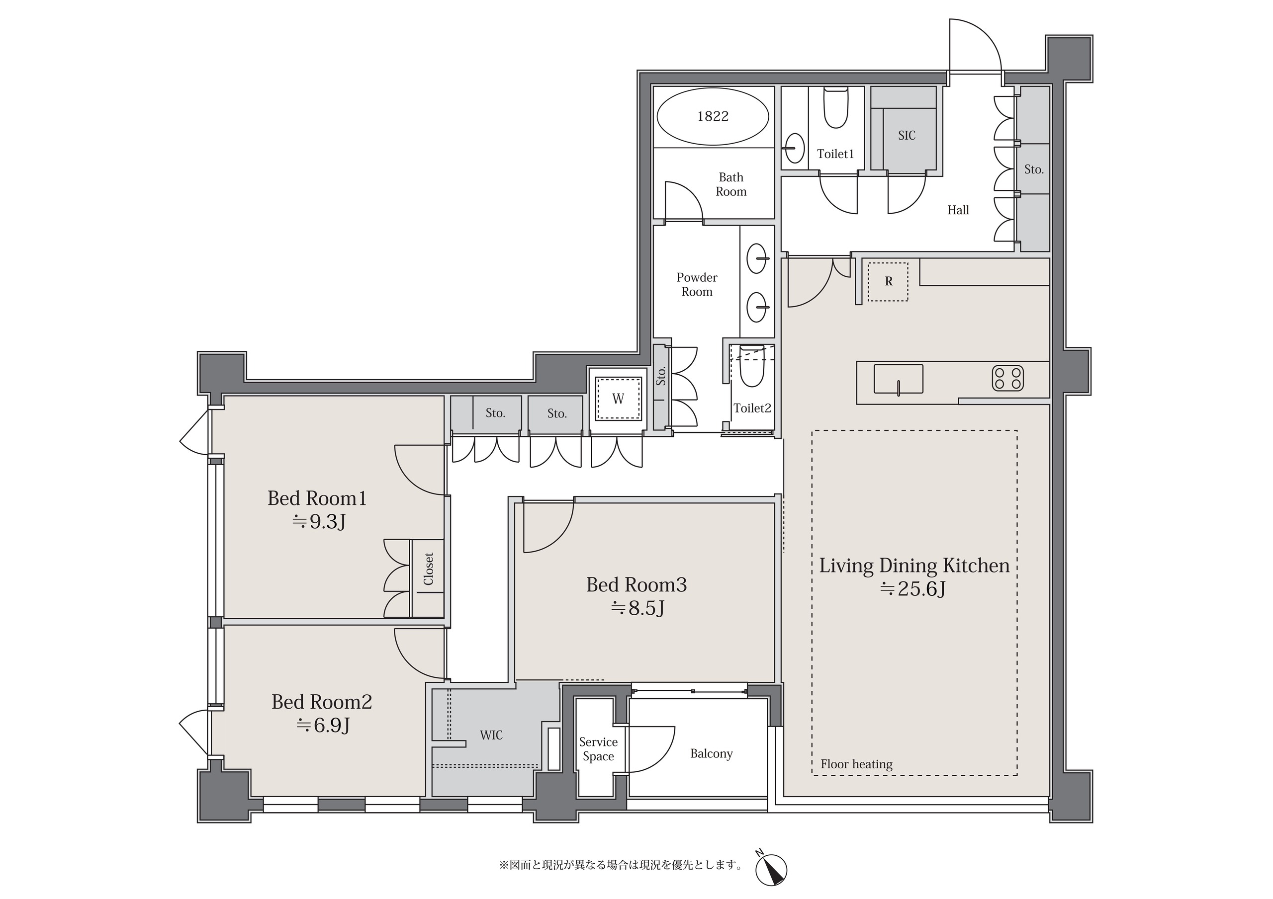 本邸は3階・南西角の住戸位置にあり、3LDK+WIC+SICの間取りに約120平米のゆとりを誇ります。内装は高級感のあるブラウンの建具が空間を引き締め、上品な素材とナチュラルで落ち着いた色合いで統一された空間に仕上げました。約25畳の広々としたリビングダイニングは、折り上げ天井の間接照明がやわらかく空間を照らします。キッチンには「Miele」の大型食洗器や電子コンベックを備えました。