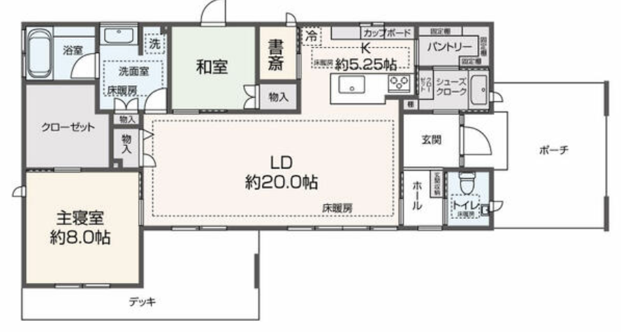 リビングダイニングは約20畳のゆとり。広々としたテラスには光がふんだんに降り注ぎ、あたたかで落ち着いたひとときをお過ごしいただけます。ぜひ現地でご体感ください。