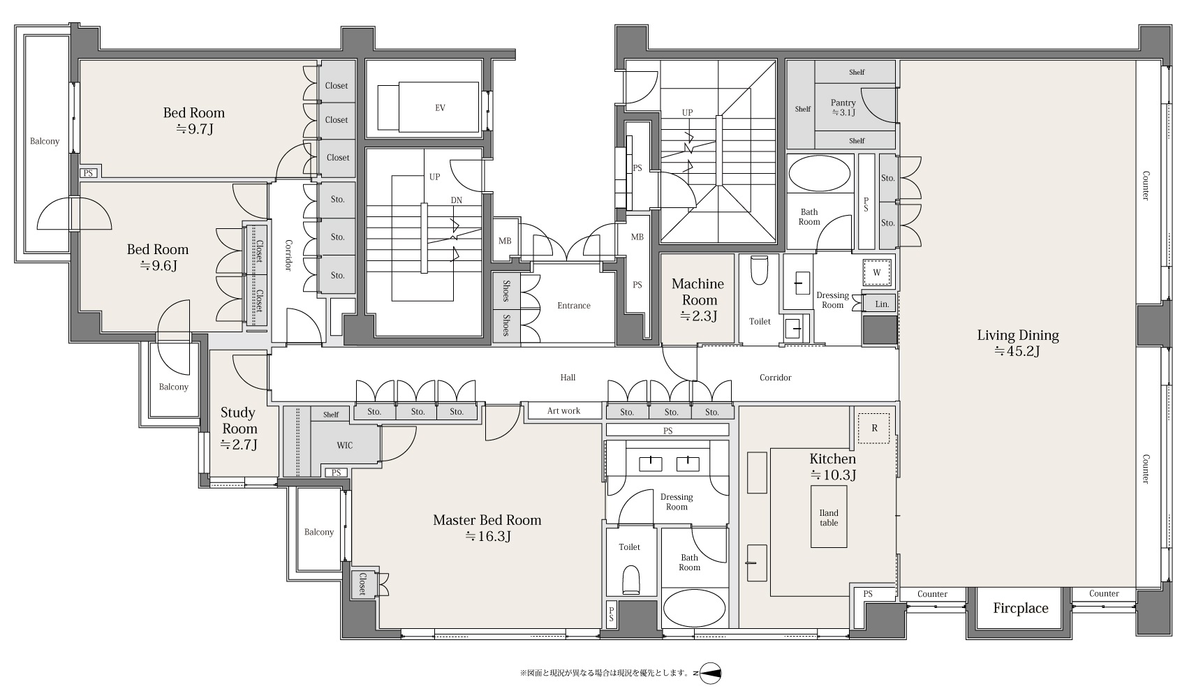 ◇約227平米のゆとりある広さを誇る、南・西・北の三方角住戸。