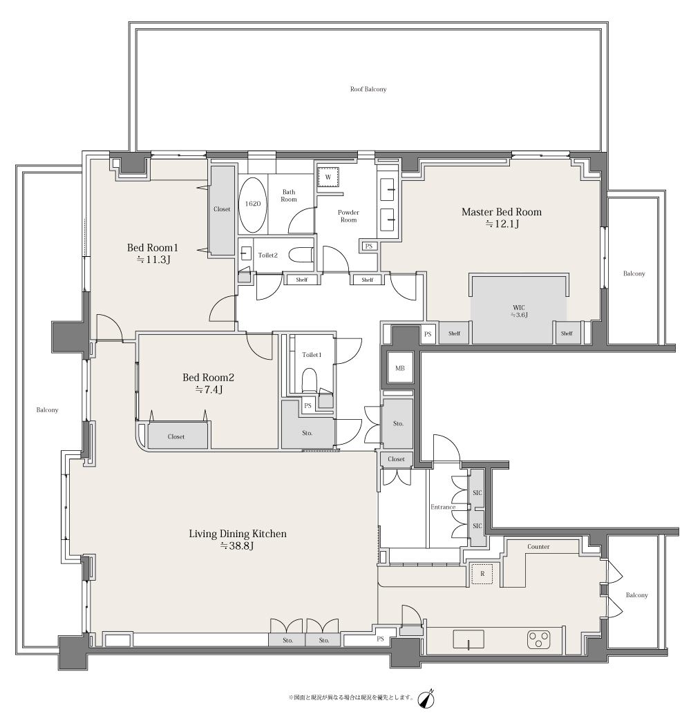 - バルコニー:33.14㎡、ルーフバルコニー:32.20㎡