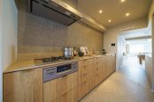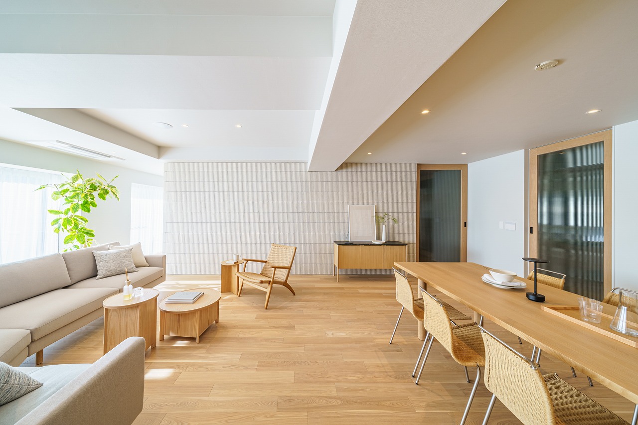 豊かな緑が感じられる立地にある本邸は、木やタイルなどの素材を用いた穏やかな空間に仕上げています。緩やかに広がるリビングダイニングは、動線をカーブで仕上げた壁面が伸びやかに広がりを感じさせ、シンプルながら存在感もあるタイル仕上げによって優しい空間となりました。