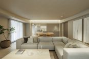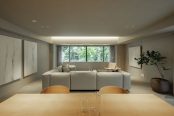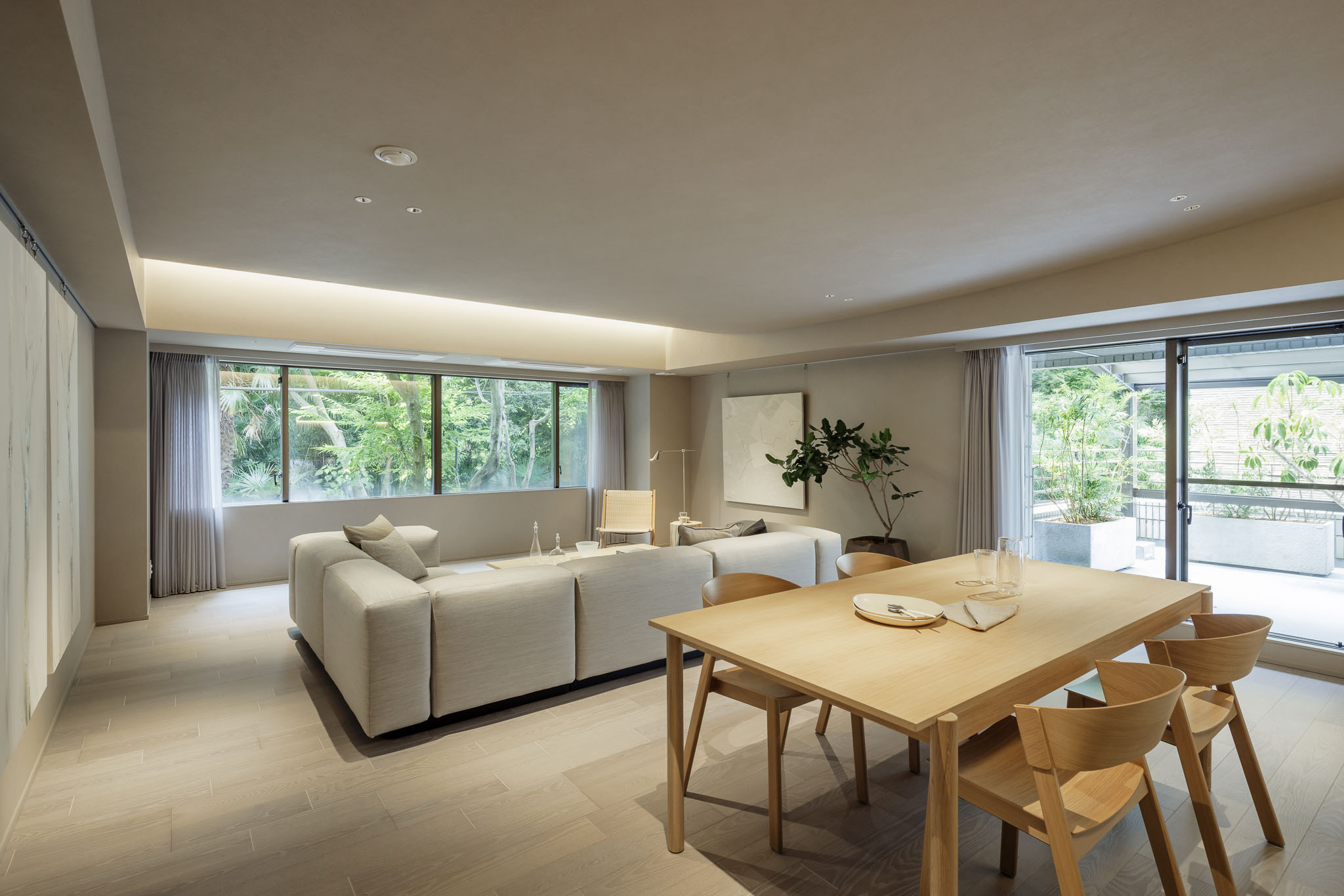 リビングダイニングは約30畳とゆとりがあり、キッチンカウンターは天井と呼応する曲線を用い、リビングダイニングとゆるやかに空間をつなげます。南西側の腰窓からは隣接する自然教育園の緑を借景に、額縁のように切り取った緑の景色をお愉しみいただけます。リビングダイニングの照明は、日中・夕方・夕食・バータイムの4つの照明パターンで構成。シーンにあわせて照明を切り替え、心地よくお寛ぎいただけます。