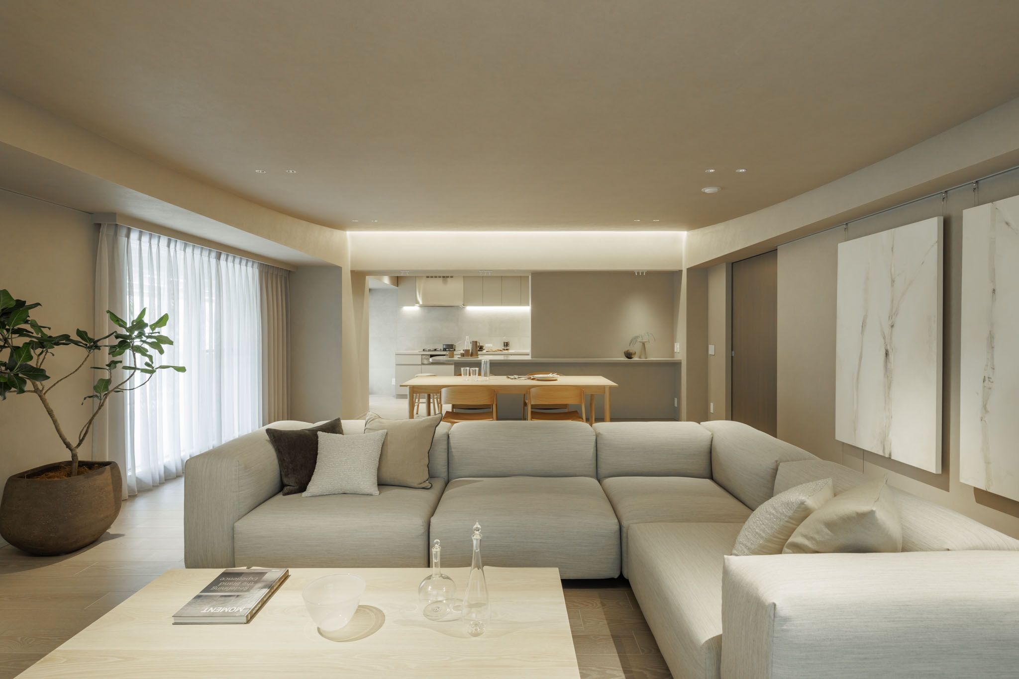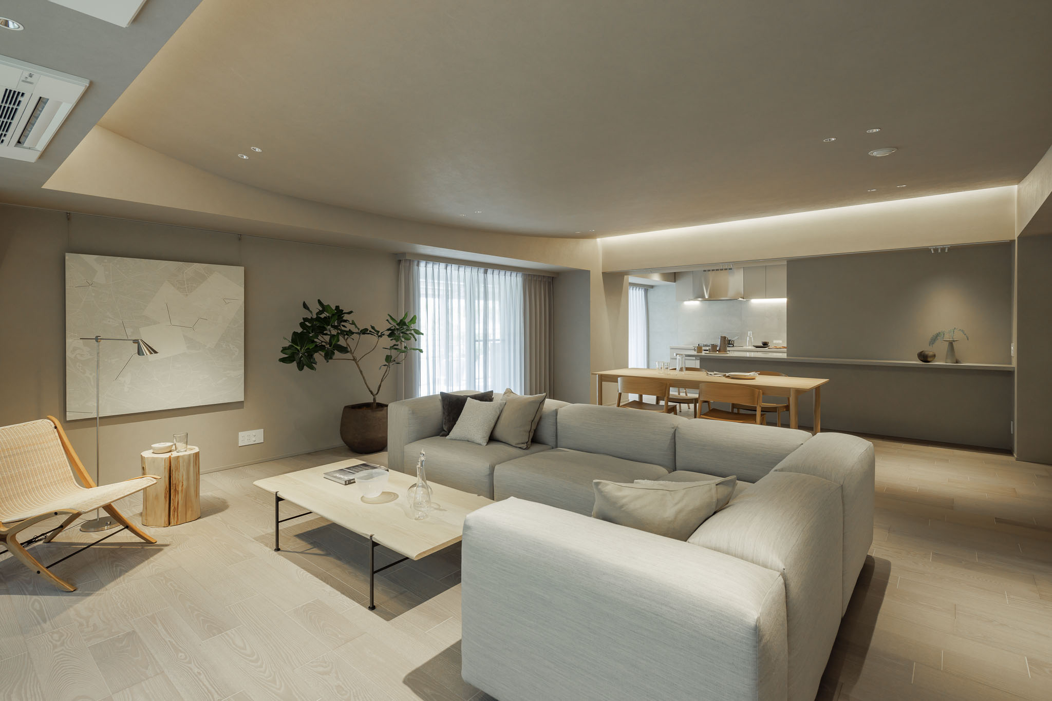 本邸は2階・南西向き・200平米超のゆとりを誇る一邸です。室内は天井を曲面で仕上げ、窓から差し込む自然光と間接照明によって光がやわらかく広がり、美しい陰影がうまれます。壁や床などの素材は落ち着いた色合いでトーンを合わせ、上質で心地よい空間に設えました。