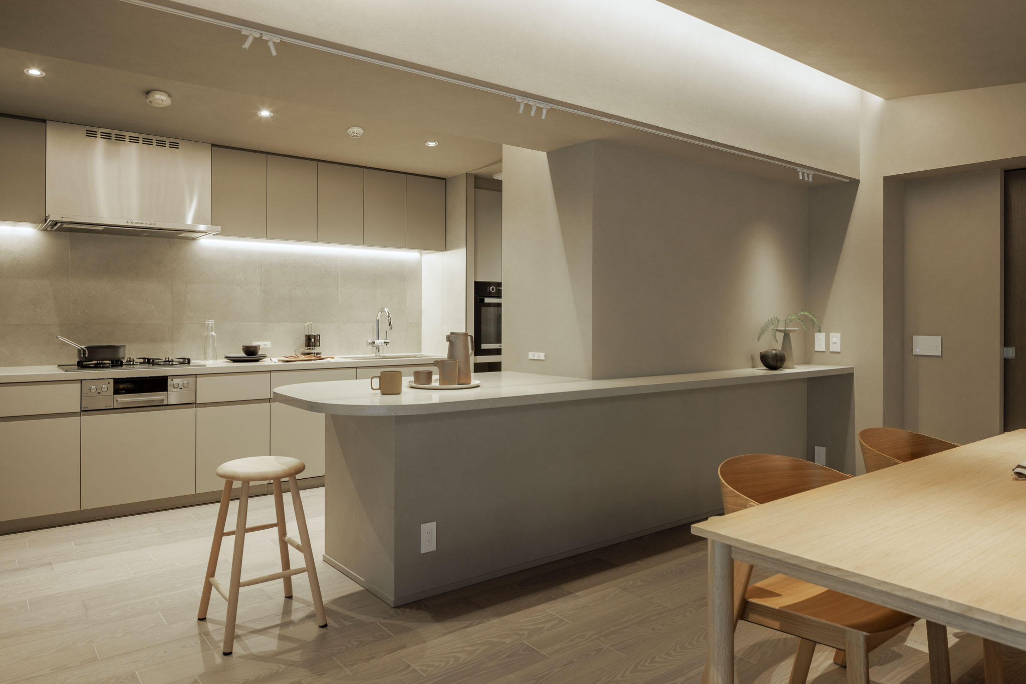 このかけがえのない眺望をより美しく引き立てるため、空間全体はグレージュを基調に、素材の質感にこだわって丁寧に整えました。