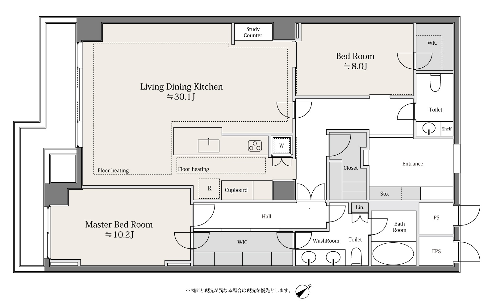 また、主寝室は約10.2畳、もう一方の寝室は約8.0畳を確保し、それぞれに大型のウォークインクローゼットを配置。2つのトイレや洗面室など、水回りも全面的に刷新されており、機能美と快適性を両立しています。