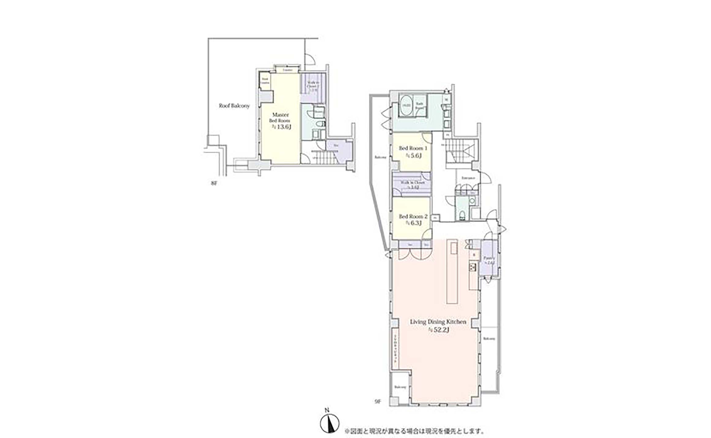 本邸はメゾネットタイプ。下階にメインベッドルームから続く広いルーフバルコニーを持ち、休息の時間も自由で豊かなすごし方ができる一邸です。