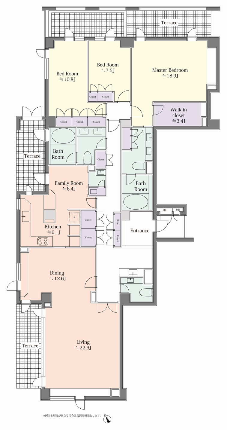 玄関から左右にPP分離し、35畳以上のリビングダイニング、キッチン奥のファミリールーム、各居室の収納など、プライベートの空間も大切にしながら、225㎡を超える広さと開放感を最大限に生かした間取構成。