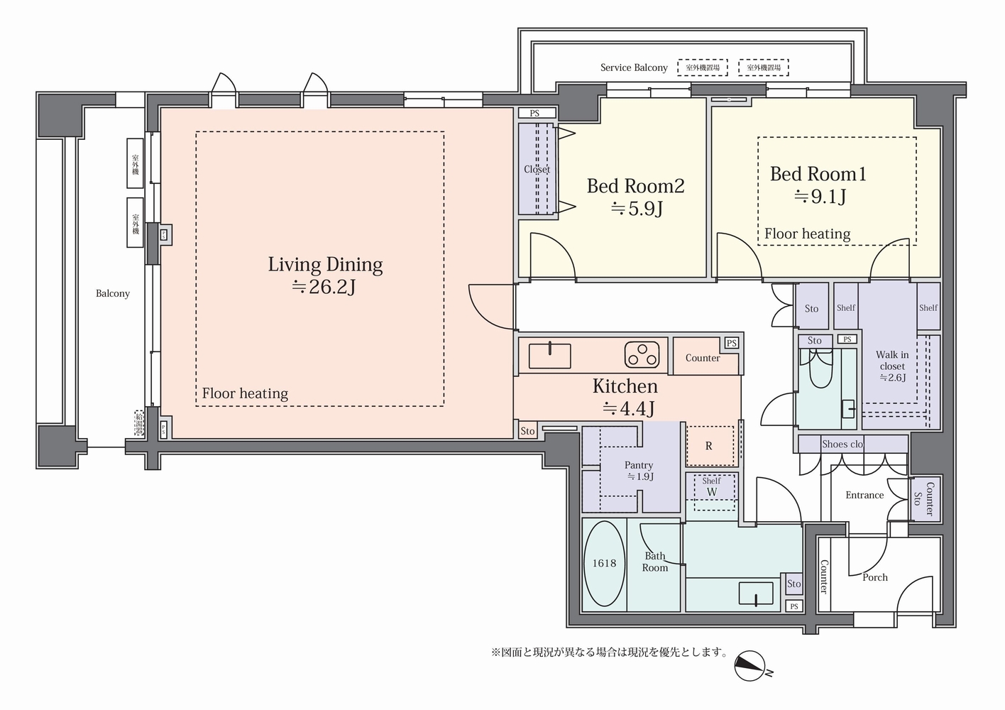 リビングダイニングと主寝室には床暖房を備え、主寝室には約2.6帖のウォークインクローゼットも完備しています。