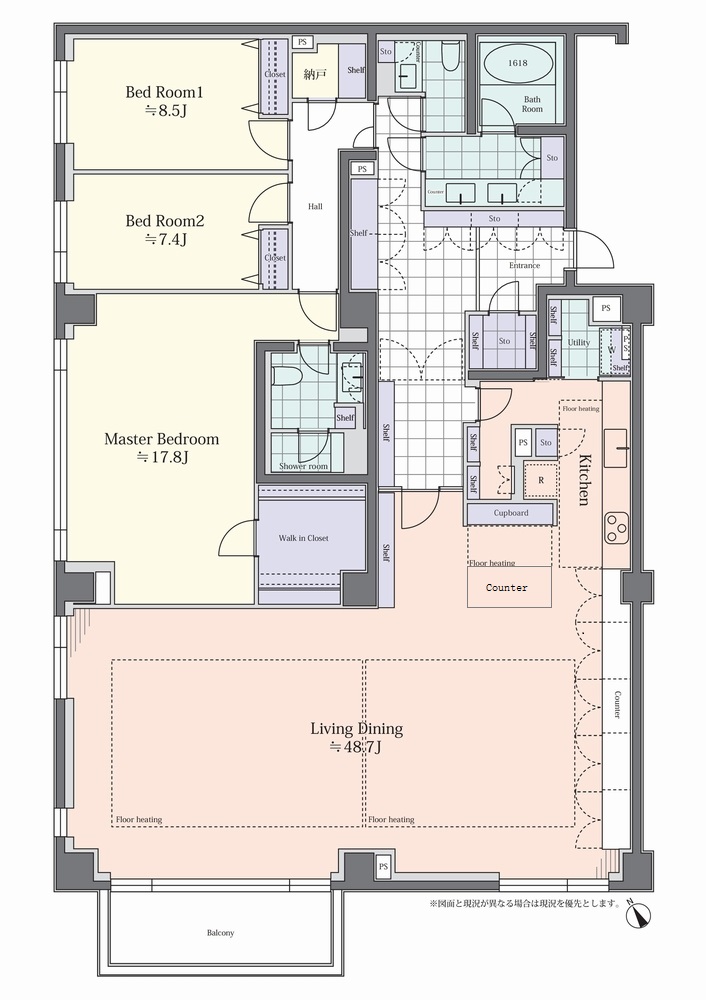広い玄関ホールは、フラットに設えられた床タイルが美しく広がり、訪れる人を迎え入れます。玄関を入って右側はプライベート空間。3つの居室が配置されており、カーペット敷きでリラックスした雰囲気を楽しむことができます。主寝室にはウォークインクローゼット、トイレ、洗面、シャワールームを完備しています。他、バスルームと洗面室、トイレが1つずつあり、忙しい朝でもスムーズに動ける設計です。