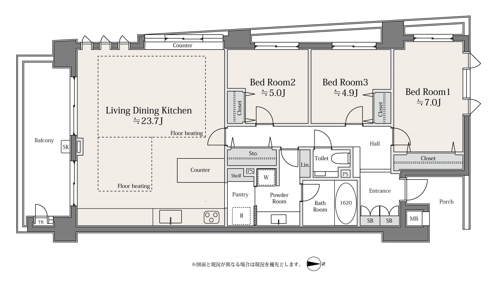 本邸はすべての洋室が共用部廊下と接しない間取りとなっており、角部屋の良さが際立つプライバシー性の高い住まいです。