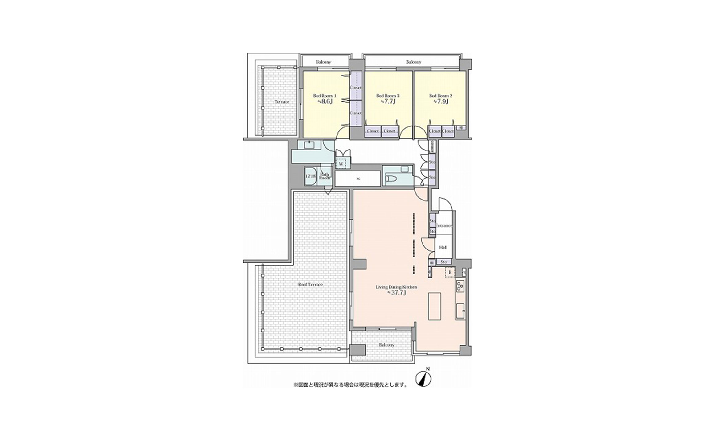 今回はゆとりの140平米に広々とした60平米のルーフテラス付の住戸です。木製のルーバーを入口に配して緩く仕切りつつ、37畳の広々としたLDKを確保したプラン。プライベートゾーンはパブリックゾーンと分離させ、やすらげる空間となっております。都心に隣接する便利な立地でありながら、豊かな自然を身近に感じられ、優雅な暮らしが実現できる希少性の高い住まいです。