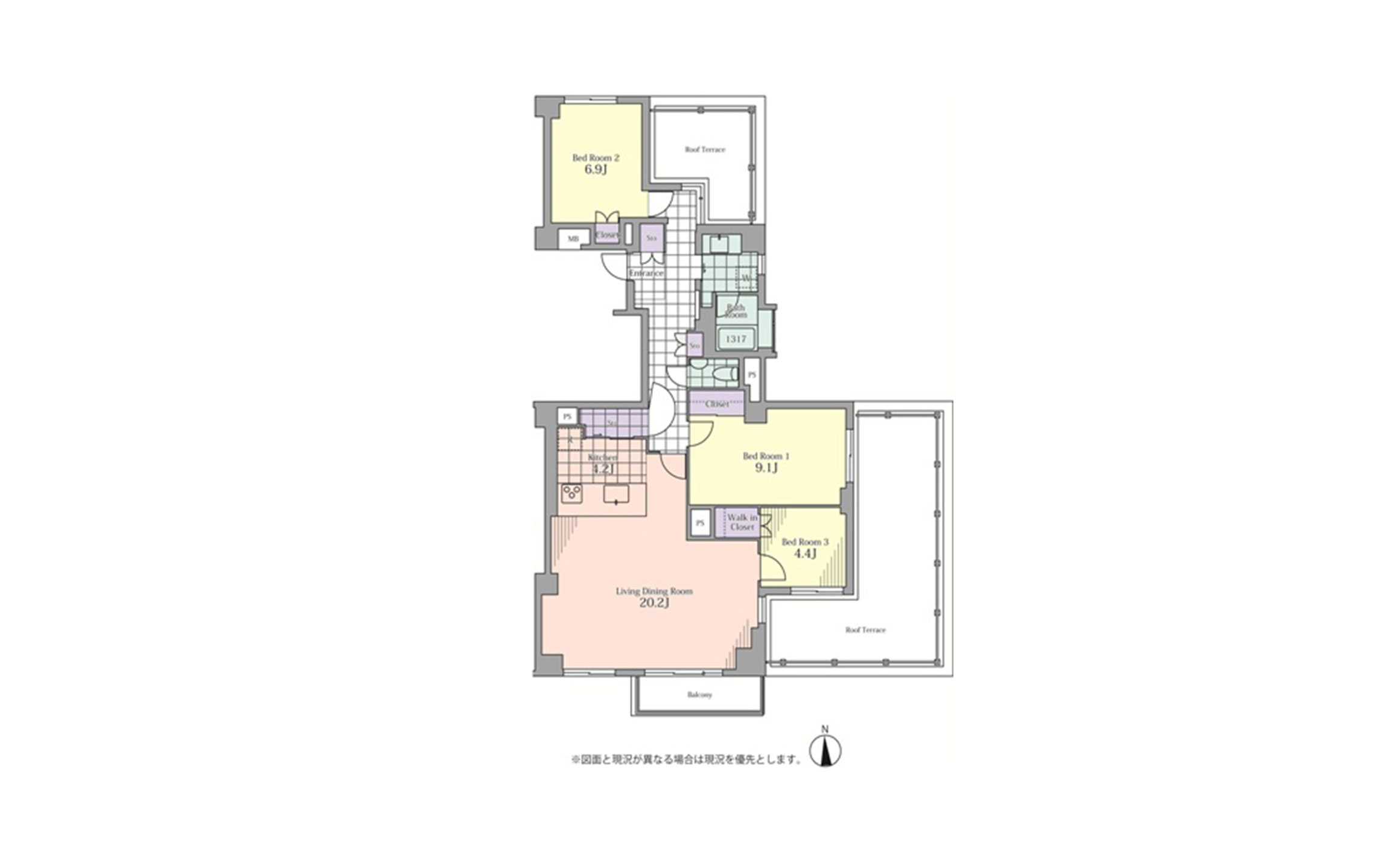 国分寺崖線のヒルトップに立地するヴィンテージマンション、最上階・ルーフテラス付住戸です。玄関を入ると、エントランスから廊下まで続く白いタイルが輝き、その先には約20畳のリビングダイニングが広がります。さらに窓外には遮るもののない眺望と空。お部屋の中からでも、ルーフテラスからでも楽しめます。今回のリノベーションにて、クローズ型のキッチンをオープンタイプのカウンターキッチンに変更し、人気のクッチーナ製を採用しました。キッチン横にストックルームも設け、使い勝手良い導線に変更しております。リビングに隣接する2室の洋室の間取りと導線も変更し、よりリビングの空間を広げるとともに、寝室・また書斎として使い勝手の良い空間へ調整、十分な収納量も確保いたしました。