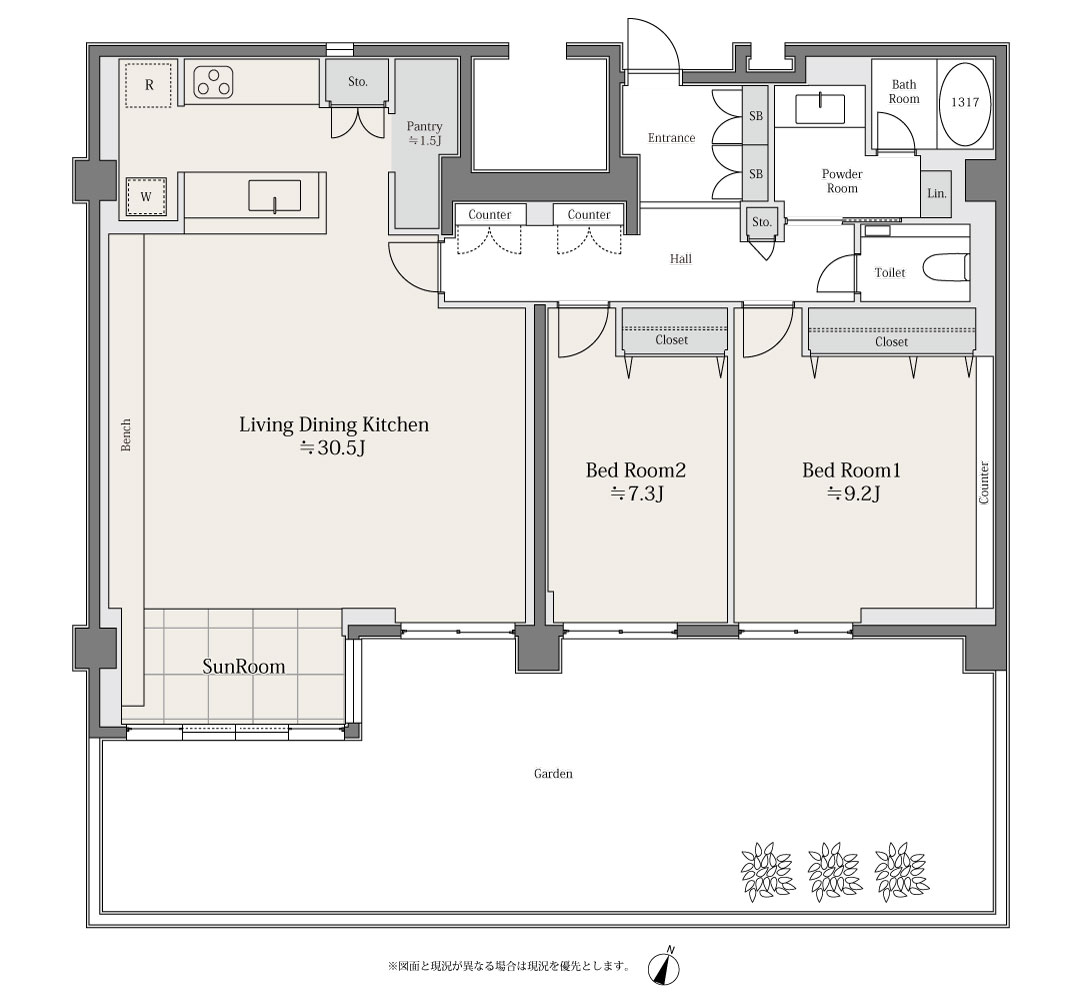本邸は1階・100平米超の2LDK+SunRoomの間取りです。全室南向きで光を多く取り込む、あたたかな住まいです。