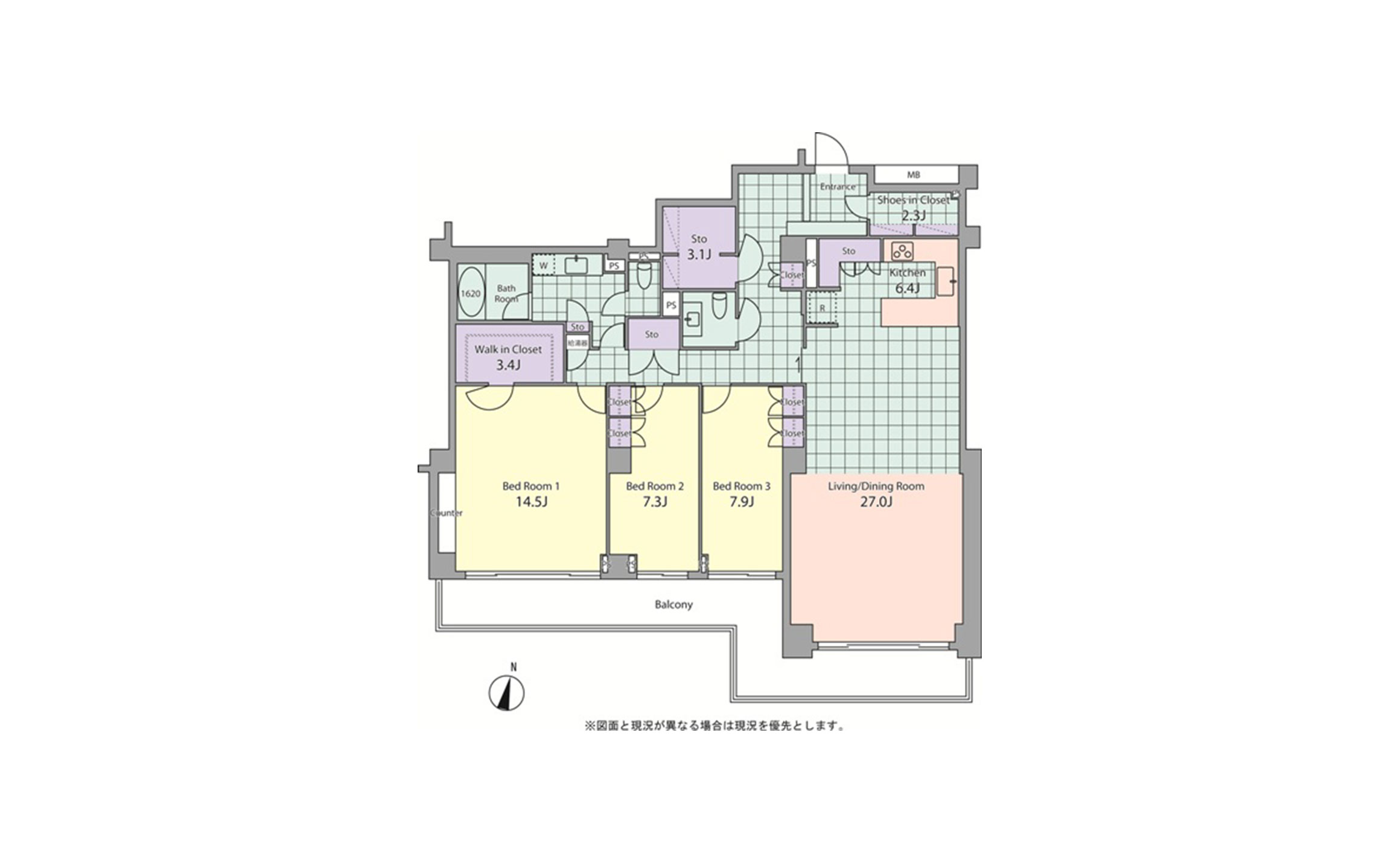 リビングダイニング・キッチンで約34畳、マスターベッドルームは約14.5畳と、ゆとりあるプランです。