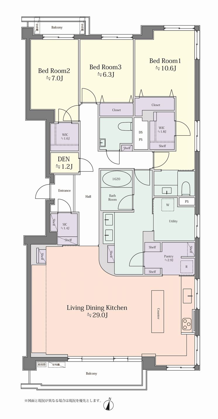 南東角部屋、150平米超の開放的な3LDKの間取り。アールの壁面や随所に見られる折り上げ天井は、光を美しく反射し、曲線と直線が織りなすやわらかな連続性が空間を上品に仕上げます。広い窓からは眺望が抜け、落ち着いた色合いでまとめた室内に青い空と緑が映えます。夜は間接照明のやさしい光が立体感を演出し、異なる雰囲気を纏います。WIC・SIC・パントリー、ユーティリティ・DENなど収納が充実しているのも本物件の魅力。生活感をしまい、アートやインテリアを楽しむ空間に。質感豊かな素材と落ち着いた白を基調とした空間によって、こだわりの家具、調度品、アートなどインテリアが主役となり暮らしを彩ります。