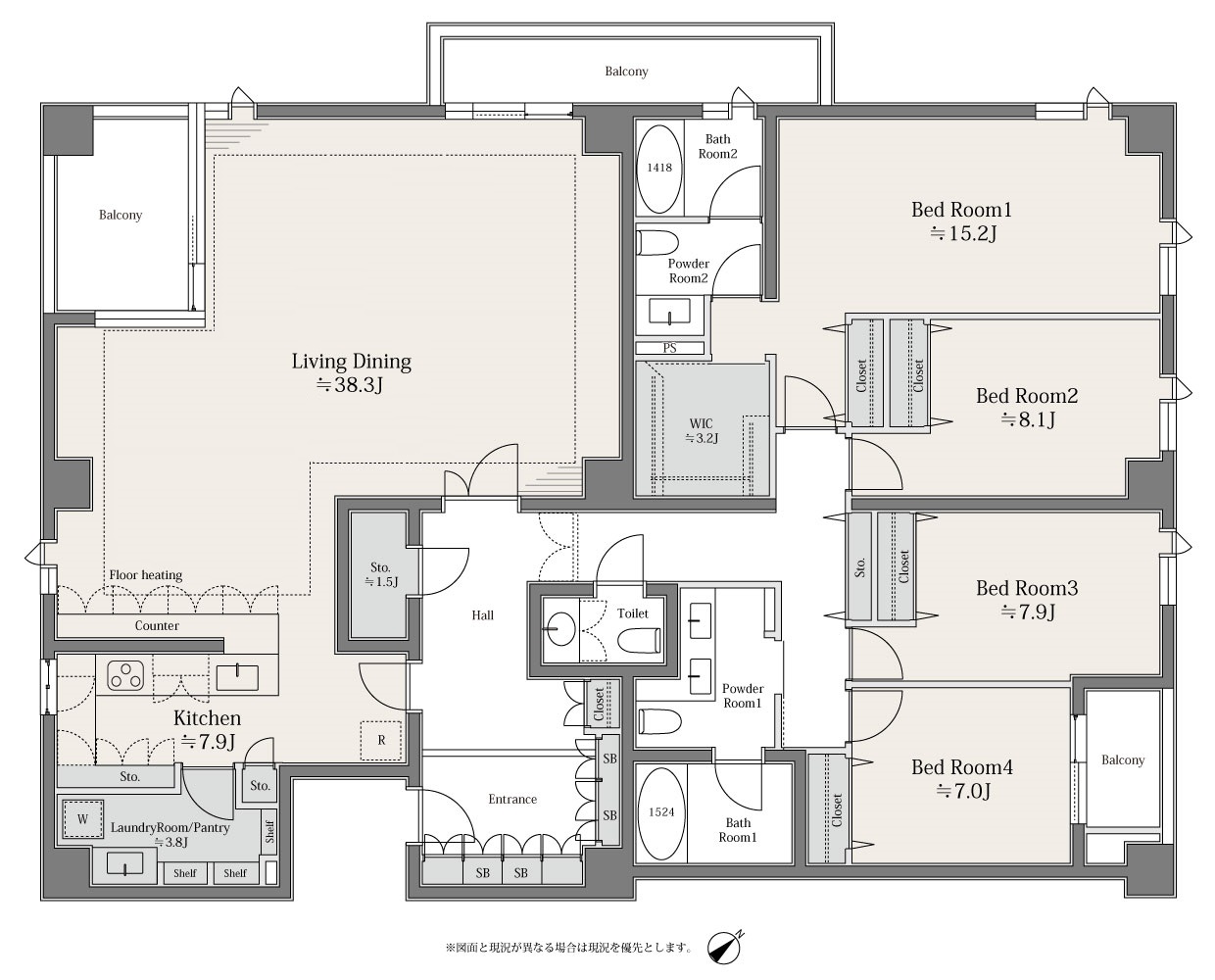本邸は南西向き・200平米超のゆとりを誇る一邸です。玄関を中心に、リビングダイニングと各居室のゾーンが分かれており、来客時にもプライバシーを守れる間取りです。