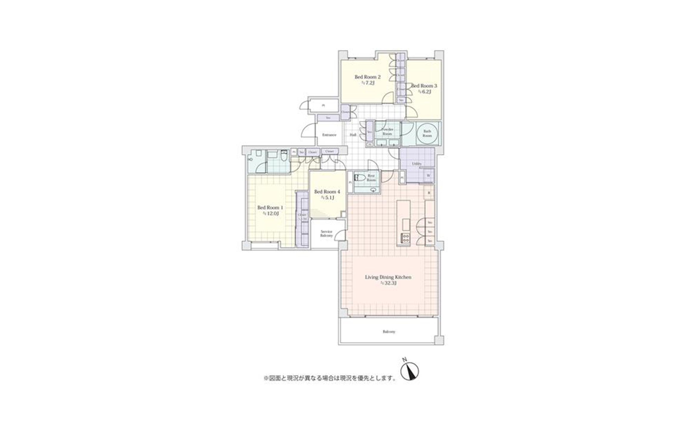 本住戸は4LDKの間取り。どの部屋も窓が広くとられており、たっぷりと日差しが注ぎます。30平米を超えるリビングダイニングは開放感があり、ゆったりとしたひと時をお過ごしいただけます。シンプルで上質に仕上げた内装に、アクセントタイルが表情を加えます。