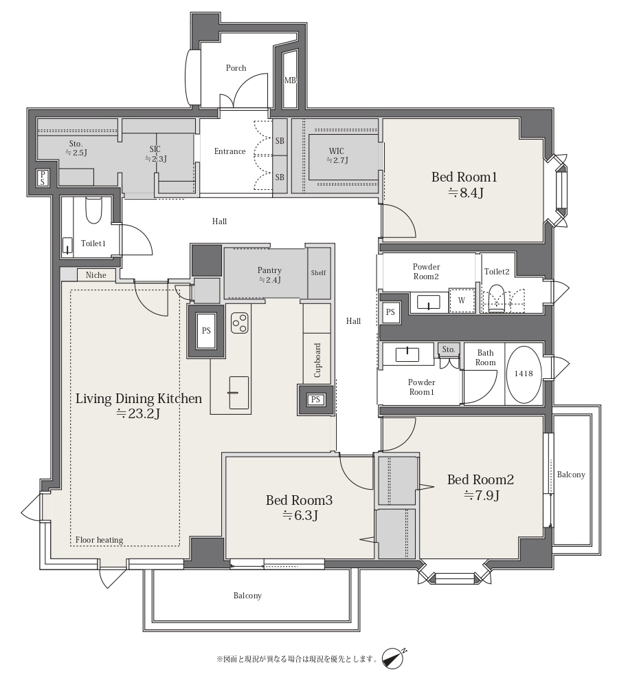 間取りは3LDK、キッチンを中心とした効率的な家事動線で、毎日を過ごしやすいように間取りを整えました。各洋室も十分なゆとりがあり、主寝室のウォークインクローゼットのほか、玄関のシューズインクローゼットやストレージ、キッチン横のパントリーなど十分な収納力を確保しました。