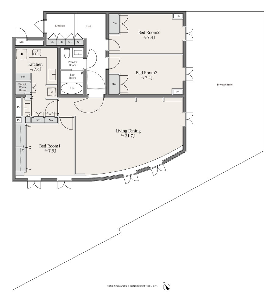 本邸は、南東から南西にかけて広がる専用庭を有する、専有面積100平米超・3LDKのゆとりある住まいです。