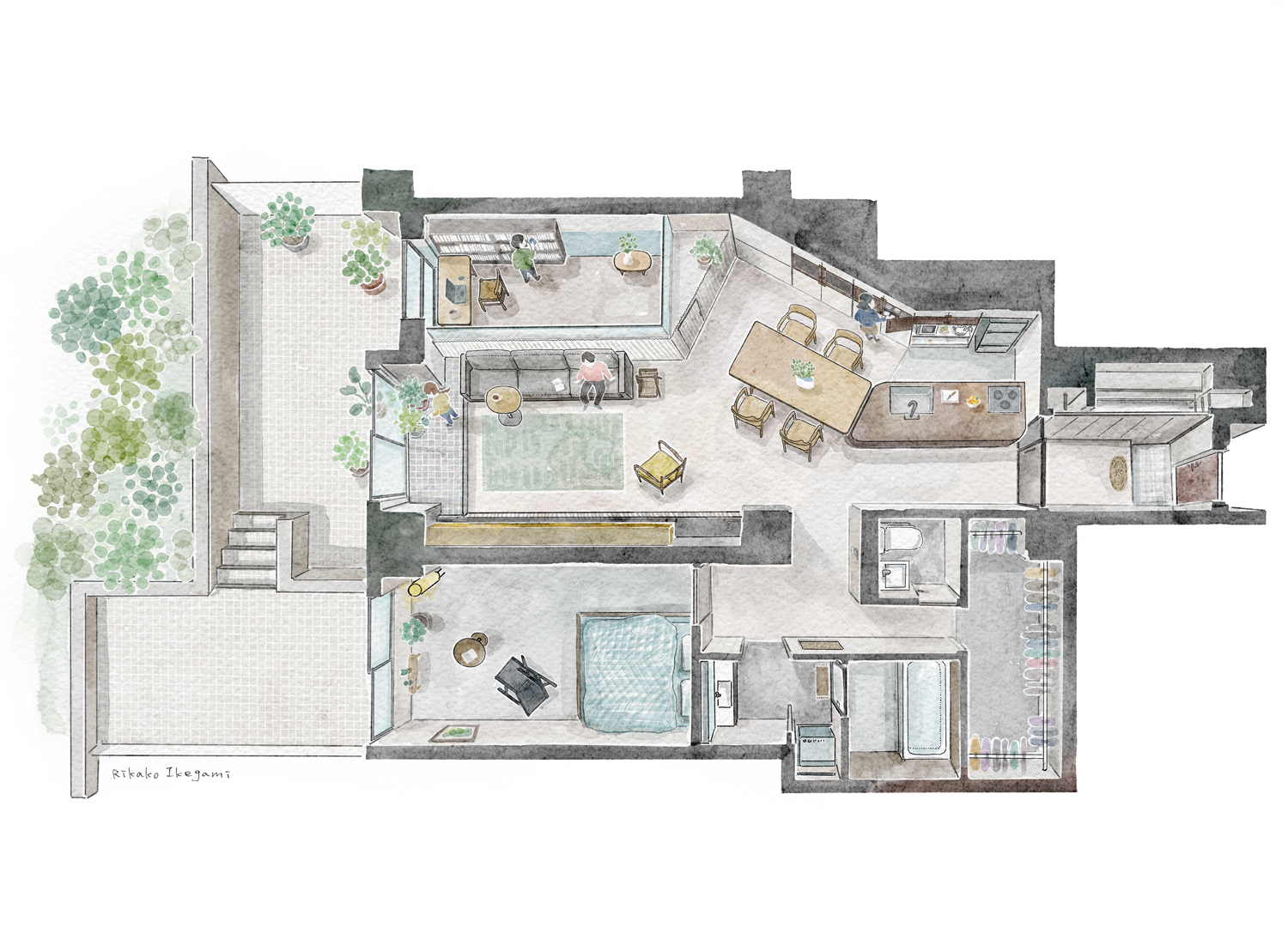 住戸は専有面積85.71㎡のテラス付き南側。史跡の残る代々木にあるこの住まいを、世代を超えても受け継がれることを目指し、”時の経過”に敬意を払った一点ものの住まいへとリノベーションしました。