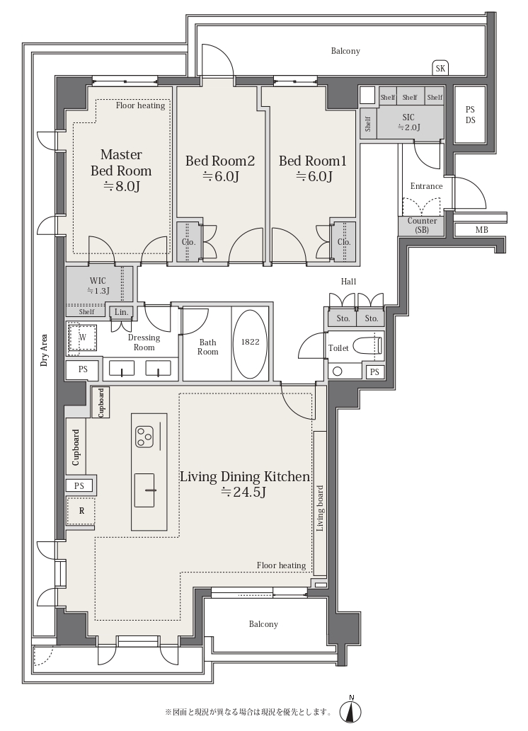 本邸はパブリックとプライベートがバランス良くゾーニングされた3LDK+WIC+SICの間取りの一邸。南向きのリビングダイニングの窓外には植栽の緑が映え、やすらぎを感じる空間。1階ならではの落ち着きのある住まいです。オープンキッチンはリビングダイニングと一体の空間で、料理をしながらご家族とコミュニケーションをとることができます。キッチンは天然石を用いた天板で高級感があり、背面に造作されたカップボードは収納や作業のしやすさにも配慮された設えです。