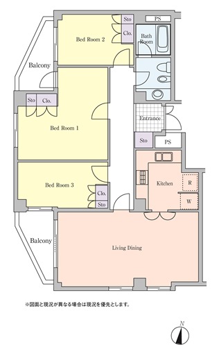 100㎡超のファミリーにおすすめのゆとりある3LDK。それぞれの居室に収納がついています。バルコニーが2箇所、シンメトリーに配置されているのが特徴で、LDからも各居室へもしっかりと採光がとれるようになっております。キッチンは収納が多く贅沢に空間が取られています。洋室からはこのマンションのシンボルツリーが見えます。