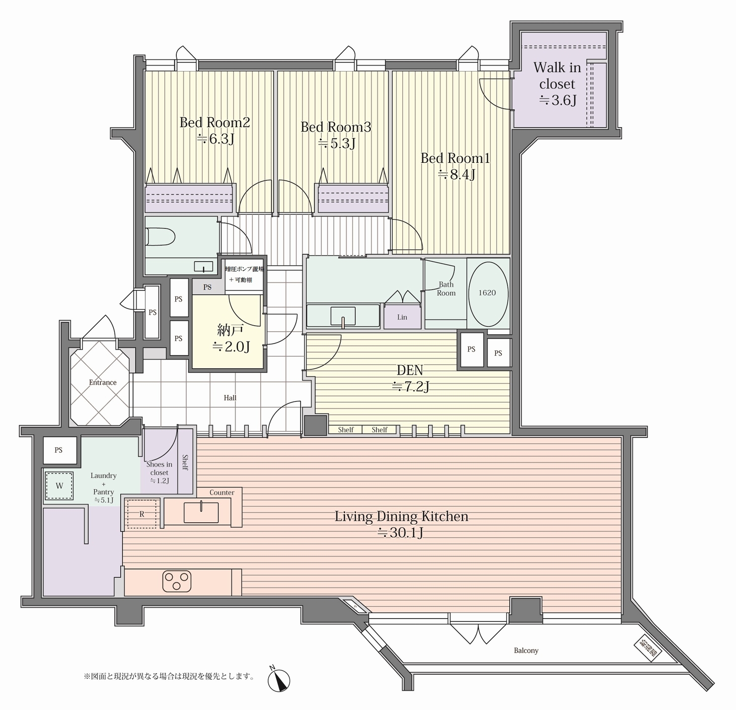 3LDKの間取りですが、さらに約7帖の大きなDEN空間を設けており、寝室としてもワークスペースとしても活用できます。(スリットガラスによりLD越しの光を取り込み、家族の存在を程よく感じられます)